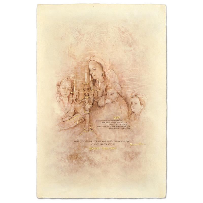 Hadlakat Nerot Shabbat by Horen, Brachi. Please see photos and description for all available information. "Hadlakat Nerot Shabt" is a mixed media giclee on handmade Indian paper with goldleaf by Brachi Horen, hand signed by the artist! This creation received personal attention by the artist in the form of water coloring and gilding. Includes Certificate of Authenticity! Measures approx. 15.5" x 23" (with border), 12" x 14" (image).