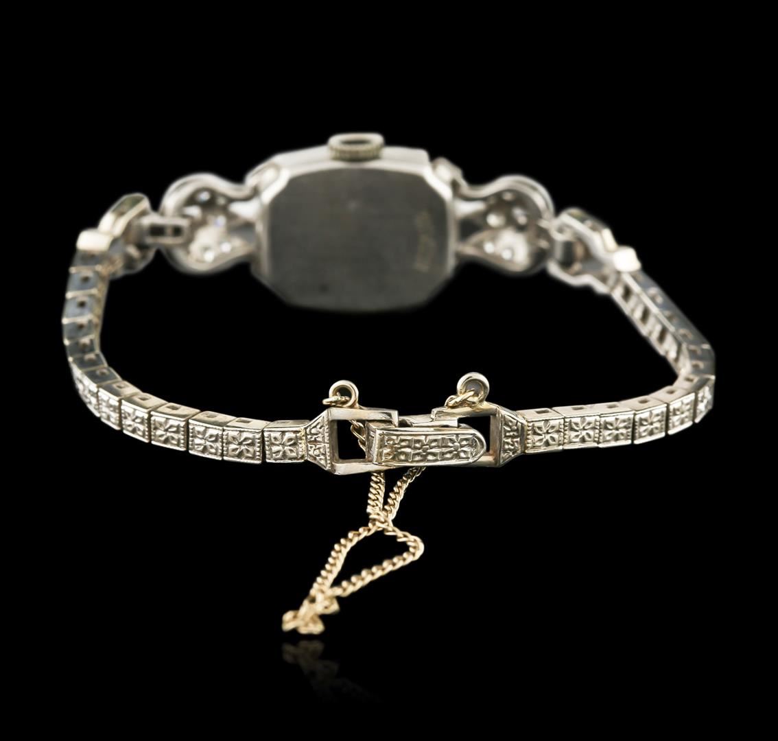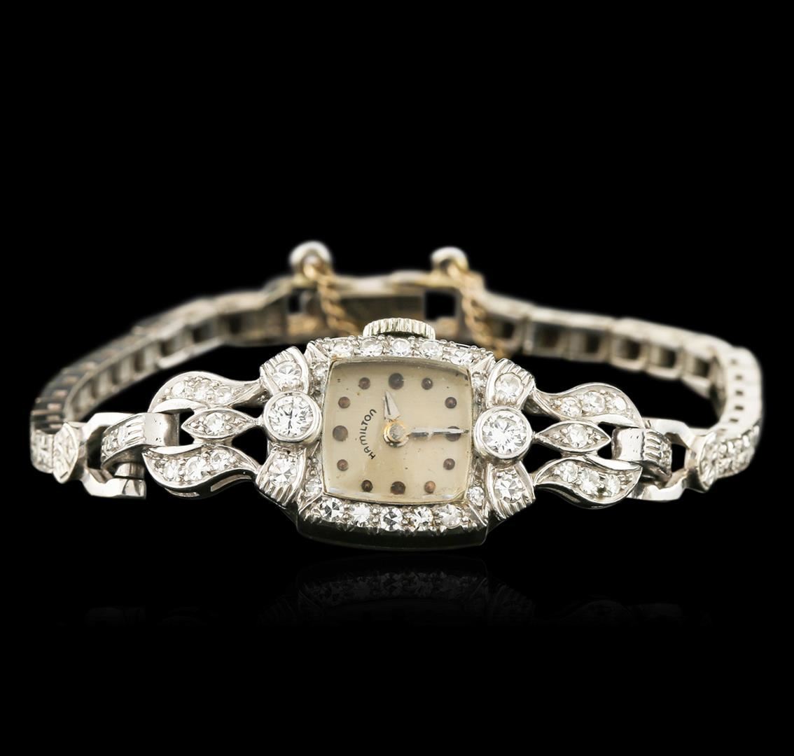 One ladies, vintage Hamilton wristwatch electronically tested, Platinum Case: 17 x 14mm, Case Back: space available for engraving, Flexible Case Lug terminals: set with diamonds, Fixed Vase Lugs: set with diamonds, Crown: scalloped edge, Bezel: diamond set, Crystal: acrylic. Hamilton USA Movement: Seventeen jewel mechanical stem wind, Hamilton Signed Dial: Dark Ivory color, pointed hands, & indices, 14KT white gold bracelet: displaying a repeated floral pattern, Condition: G-5 Fine. Five and three quarter inch length, adjustable. Containing: Thirty Eight, prong set round brilliant and single cut diamonds, approximate total weight of 38 Stones = 1.00ct. Graded in the setting. Clarity: VS-1 to VS-2. Color: G-I. Total Weight of Diamonds: 1.00ct. Total Weight of Watch: 21.63 grams. AIG Appraised at $4,650.00.