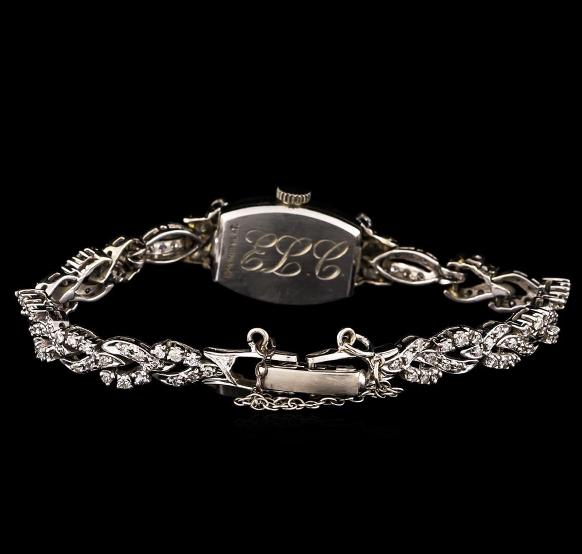 One ladies, cast & assembled Vintage Hamilton wristwatch electronically tested, Platinum Case: 18 x 14mm, Case Back: a personalized engraving that can be removed, space is available for additional engraving, Fixed Case Lugs: diamond set, Bezel: diamond set, Crystal: acrylic. Hamilton Movement: twenty three jewel mechanical, Dial: Light Ivory color, with pointed hands, indices, and the 12 o'clock numeral, Condition: G-4 average. 14KT white gold Bracelet: diamond set, six and three quarter inch length, with a fold over snap locking clasp. Containing: Eight prong set round brilliant cut diamonds, measuring 2.80 - 2.40 x 1.56mm (depth est.) approximate total weight of 8 Stones = 0.61ct. Graded in the setting. Clarity: SI-1 to SI-2. Color: I - K One Hundred Thirty-Two prong set round brilliant and single cut diamonds, measuring 1.80 x 1.40 x 0.96mm (depth est.) approximate total weight of 132 Stones = 2.06ct. Clarity: SI-1 to I-1. Color: G - J. Total Weight of Diamonds 2.67ct. Total Weight of Watch 25.32gm. AIG Appraised at $12,000.00.