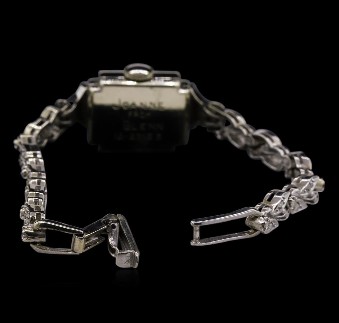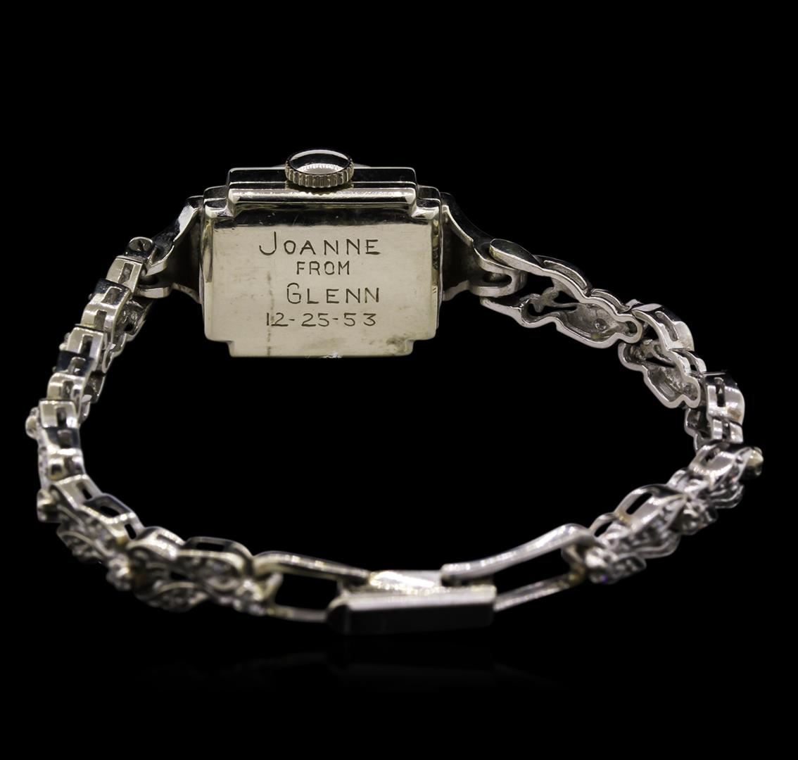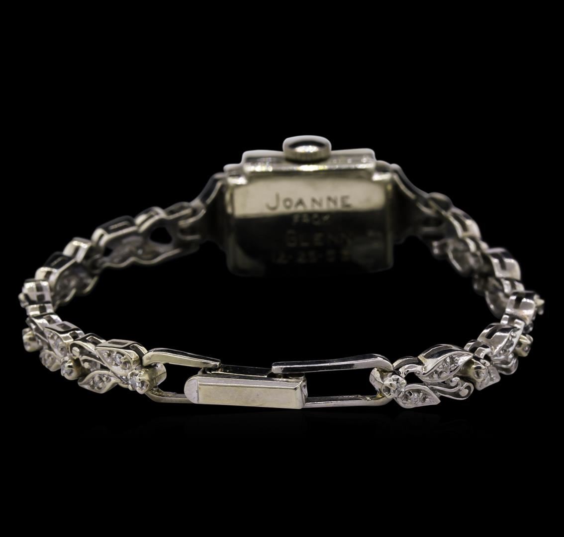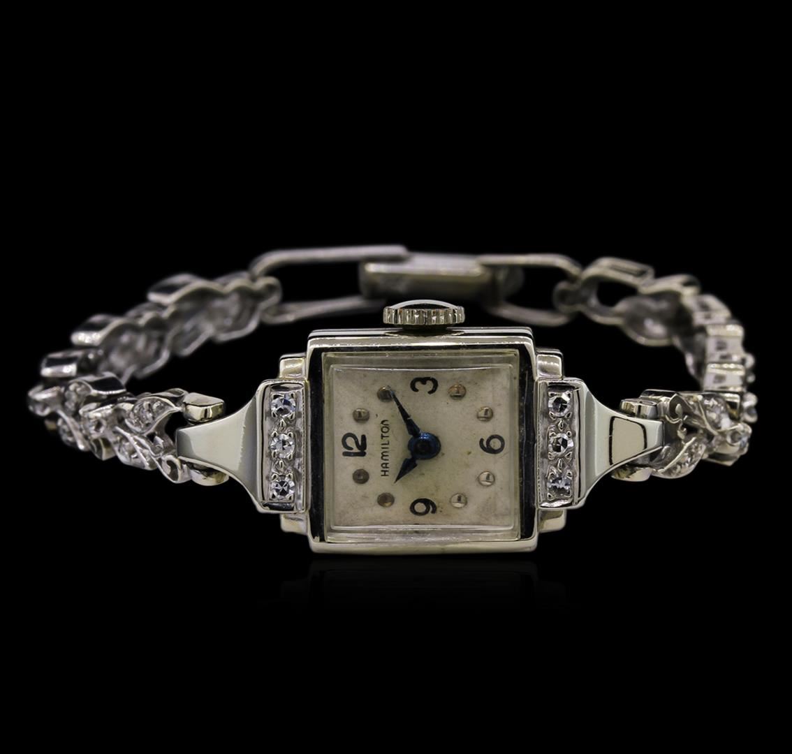 14.5 grams total weight; 5 ¾"; STAMPS: Movement: 606363A 17 Jewels Hamilton USA 750; Inside Case: 14k GOLD 244410; Back of Case: Joanne From Glenn 12-25-53; Clasp: 14k; Diamonds: 36 single cuts .01 pt each = .36 pts; Case Measurements: 14 mm x 22 mm.