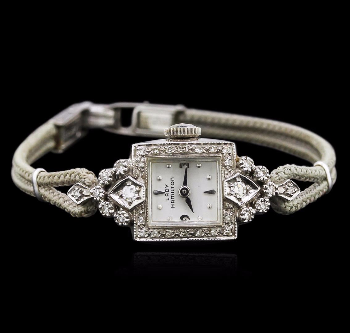 One, vintage Lady Hamilton wristwatch electronically tested 14KT white gold, Case: 18 x 14mm, Case Back: space available for engraving, Fixed Case Lug terminals: set with diamonds, Case Lugs: set with diamonds, Crown: scalloped edge, Bezel: diamond set, Crystal: acrylic. Hamilton USA Movement: Twenty Two jewel mechanical stem wind, Signed Dial: Hamilton, white color, pointed hands, indices and numerals, Bracelet: double cord, Condition: G-5 Fine. Five and three quarter inch length, adjustable. Containing: Thirty Two, prong set single cut diamonds, approximate total weight of 32 Stones = 0.52 ct. Graded in the setting. Clarity: VS-1 to VS-2 Average. Color: H - I. Total Weight of Diamonds: 0.52ct. Total Weight of Watch: 11.22 grams. AIG Appraised at $3,990.00.