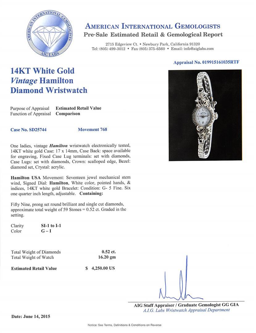 One ladies, vintage Hamilton wristwatch electronically tested 14KT white gold Case: 17 x 14mm, Case Back: space available for engraving, Fixed Case Lug terminals: set with diamonds, Case Lugs: set with diamonds, Crown: scalloped edge, Bezel: diamond set, Crystal: acrylic. Hamilton USA Movement: Seventeen jewel mechanical stem wind, Signed Dial: Hamilton, White color, pointed hands, & indices, 14KT white gold Bracelet: Condition: G-5 Fine. Six one quarter inch length, adjustable. Containing: Fifty Nine, prong set round brilliant and single cut diamonds, approximate total weight of 59 Stones = 0.52 ct. Graded in the setting. Clarity: SI-1 to I-1. Color: G - I. Total Weight of Diamonds: 0.52ct. Total Weight of Watch: 16.20 grams. AIG Appraised at $4,250.00.