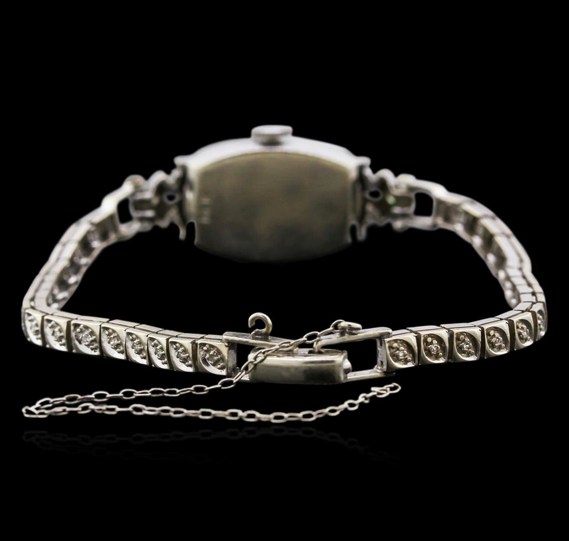 One ladies, vintage Hamilton wristwatch electronically tested 14KT White gold, Case: 19 x 14mm, Case Back: space available for engraving, Flexible Case Lug terminals, Fixed Case Lugs: set with diamonds, Crown: scalloped edge, Bezel: diamond set, Crystal: acrylic. Hamilton USA Movement: 17 jewel mechanical stem wind, Hamilton Signed Dial: pointed hands & indices, 14KT White gold Bracelet: set throughout with diamonds, Condition: G- 4 Average. Six and one half inch length, adjustable. Containing: Forty Eight, prong set single cut diamonds, approximate total weight of 48 Stones = 0.32ct. Graded in the setting. Clarity: VS-2 to SI-2 Average. Color: H - J. Total Weight of Diamonds 0.32ct. Total Weight of Watch 15.66 grams. AIG Appraised at $3,550.00.