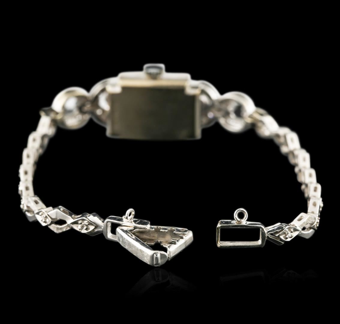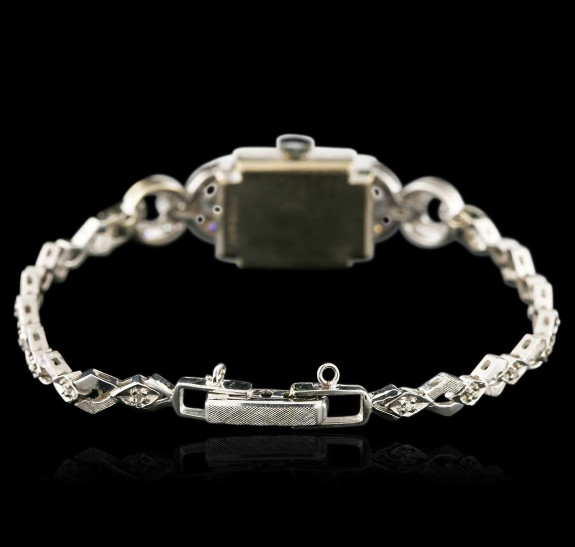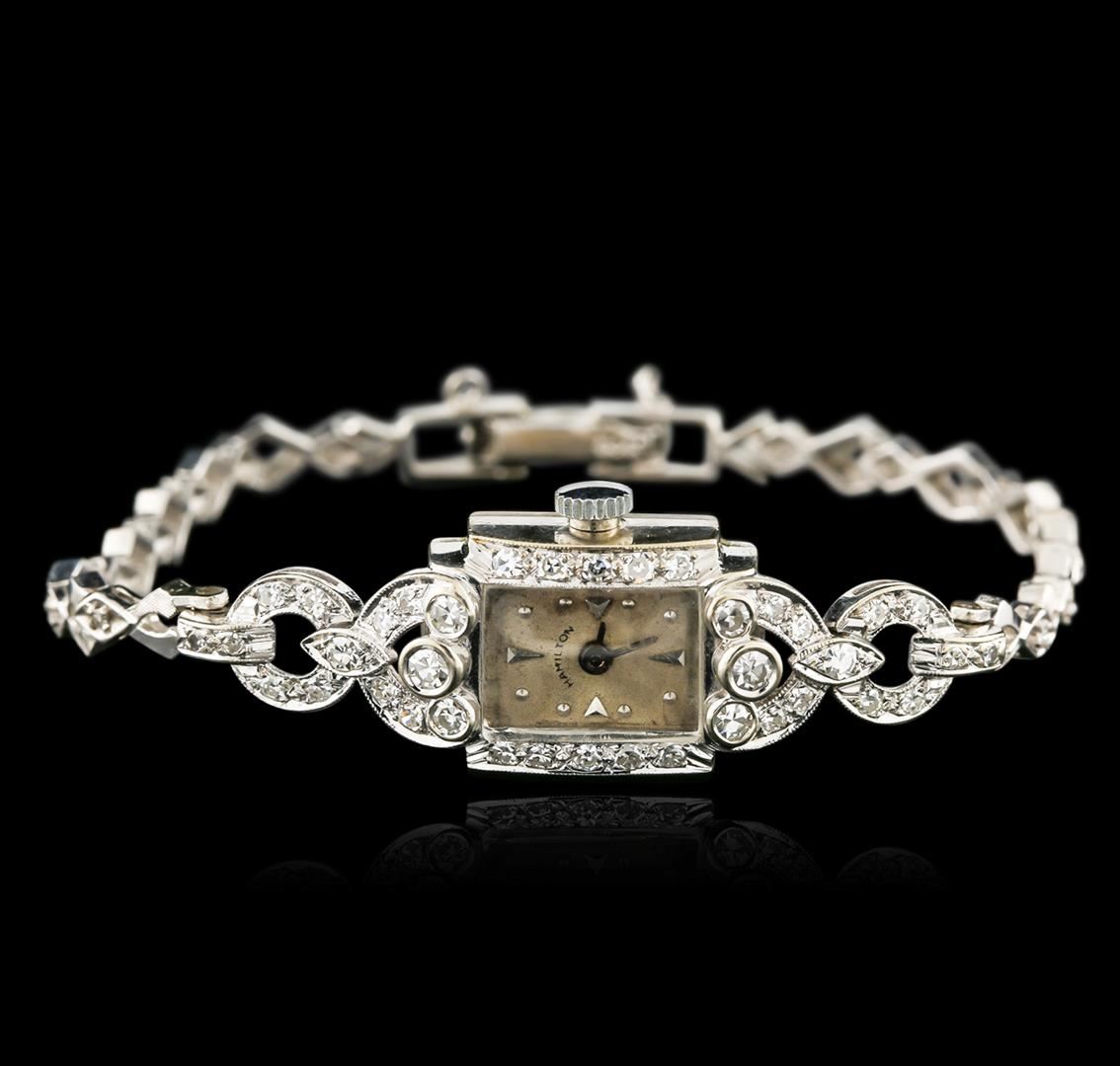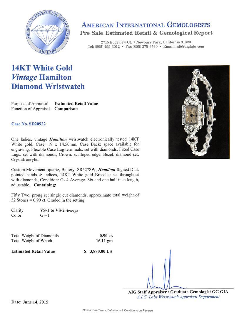 One ladies, vintage Hamilton wristwatch electronically tested 14KT White gold, Case: 19 x 14.50mm, Case Back: space available for engraving, Flexible Case Lug terminals: set with diamonds, Fixed Case Lugs: set with diamonds, Crown: scalloped edge, Bezel: diamond set, Crystal: acrylic. Custom Movement: quartz, Battery: SR527SW, Hamilton Signed Dial: pointed hands & indices, 14KT White gold Bracelet: set throughout with diamonds, Condition: G- 4 Average. Six and one half inch length, adjustable. Containing: Fifty Two, prong set single cut diamonds, approximate total weight of 52 Stones = 0.90ct. Graded in the setting. Clarity: VS-1 to VS-2 Average. Color: G - I. Total Weight of Diamonds 0.90ct. Total Weight of Watch 16.11 grams. AIG Appraised at $3,880.00.