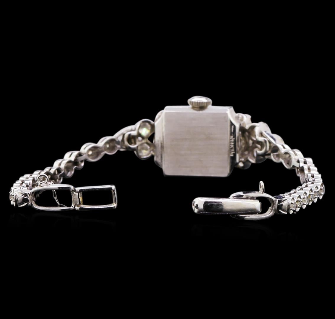 One Hamilton vintage ladies watch featuring: Case: 14KT white gold set with diamonds. Dial: White color; silver tone hour and minute hands; silver tone hour markers. Bracelet: 14KT white gold set with diamonds.
