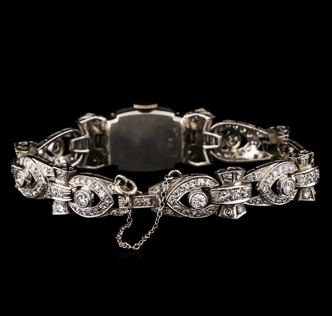 One ladies, cast & assembled Mid Century design Hamilton diamond "Case Cover" wristwatch electronically tested platinum. Case: 18 x 14mm, Case Back: space available for engraving, Case Cover: set with diamonds, hinge mechanism with a locking feature, Crown: scalloped, Bezel: diamond set, Movement: No. 911, Hamilton USA seventeen jewel, Dial: Light Ivory color, with pointed hands, and American style numerals. Bracelet: diamond set, Condition: G-5 Fine. Six inch length. Overlocking clasp, with safety. The bracelet is supported by the fixed case lugs, connected to the case, the case and case cover create a central plaque of diamonds. The center plaque conceals a watch by Hamilton Watch Co. Containing: Seven bezel set round brilliant cut diamonds, measuring 3.30 - 3.20 x 1.95mm (depth est.) approximate total weight of 7 Stones = 0.97ct. Graded in the setting. Clarity: VS-2 to SI-1. Color: H - I Five bead set single cut diamonds, measuring 2.20 - 2.10 x 1.29mm (depth est.) approximate total weight of 5 Stones = 0.20ct. Graded in the setting. Clarity: VS-2 to SI-1. Color: H - I One Hundred Thirty-Two bead set single cut diamonds, measuring 1.70 - 1.50 x 0.96mm (depth est.) approximate total weight of 132 Stones = 2.06ct. Graded in the setting. Clarity: VS-2 to SI-1. Color: G - I. Thirty-Two bead set single cut diamonds, measuring 1.40 - 1.50 x 0.87mm (depth est.) approximate total weight of 32 Stones = 0.40ct. Graded in the setting. Clarity: VS-2 to SI-1. Color: G - I Twelve channel set baguette cut diamonds, measuring from 2.40 x 1.70 x 1.19mm (depth est.) to 3.70 x 2.20 x 1.54mm (depth est.) approximate total weight of 12 Stones = 1.00ct. Clarity: VVS-2 to VS-1. Color: G - J. Total Weight of Diamonds 4.63ct. Total Weight of Watch 38.86gm. AIG Appraised at $21,000.00.