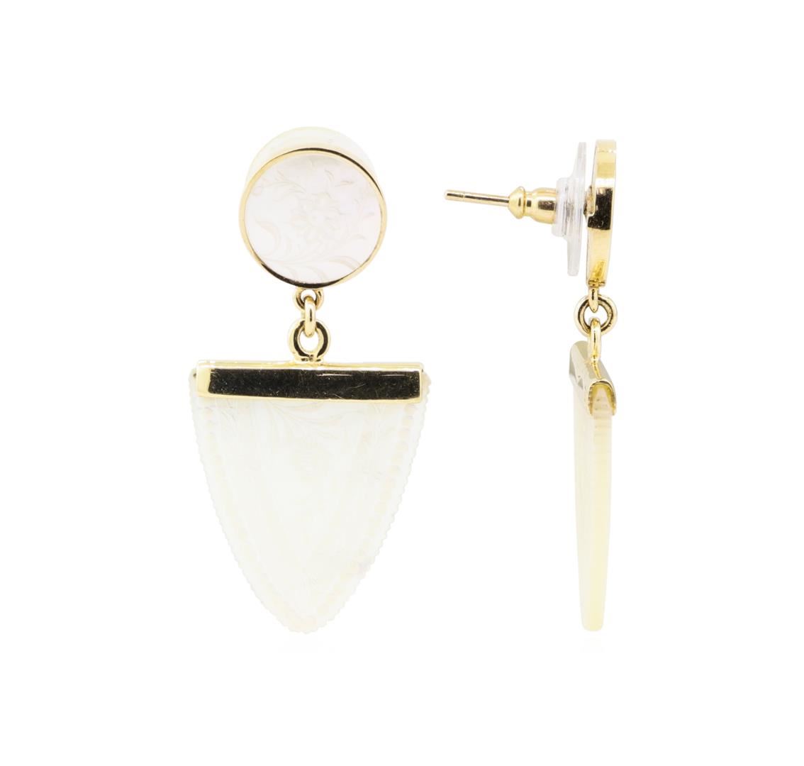 One pair of hand-engraved mother of pearl dangle earrings with a total drop of approximately 43 millimeters featuring: 14KT yellow gold weighing 7.3 grams featuring two pieces of circular hand-engraved mother of pearl and two shield shaped hand-engraved pieces of mother of pearl.