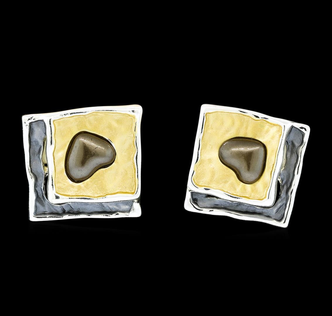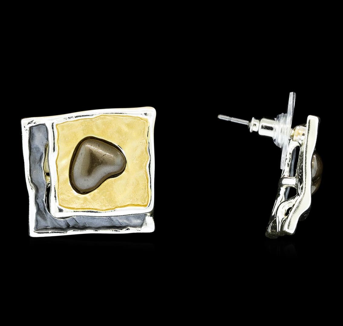 High end designer jewelry. Hand Painted Square Earrings - Rhodium Plated. Rhodium Plated Metal. Slv/ Gld/ Blk. Stud. Total Weight: 7.8 grams.