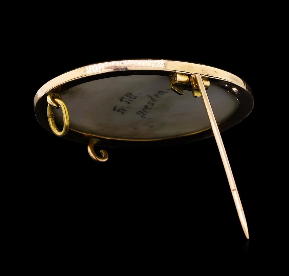 One hand signed Franz Till 14KT yellow gold porcelain pin. The portrait of an elegant lady, who is probably German, and is signed "F. Till Dresden". It dates from 1890-1910. The signature is that of Franz Till of Dresden, who Blattel advises was active around 1866. Blattel notes that he was known for portraits on porcelain, copies, and photographs. Blattel makes a further note; "Porcelain Painting Company: Vienna and Meissen style". Thus it is not clear if perhaps, Franz Till started as an individual painter, and then grew into a company which was active for the remainder of the 19C. Comes with original box.