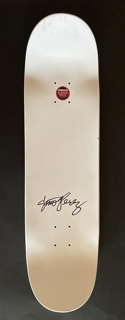 Grey Compliments Blue Period by Gino Perez. "Grey Compliments Blue Period" is a wood Sugar Skate Co deck, with hand painted original artwork by Gino Perez, and hand signed. Measures approximately 32" x 8.5". Year: 2019. Never mounted or displayed.