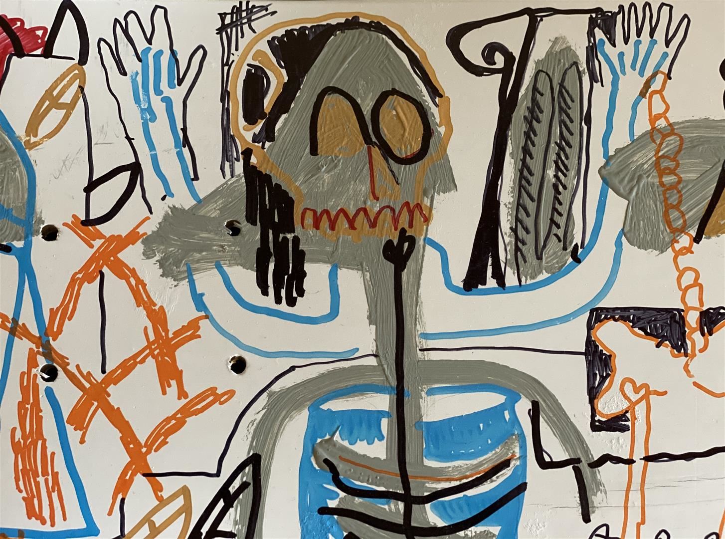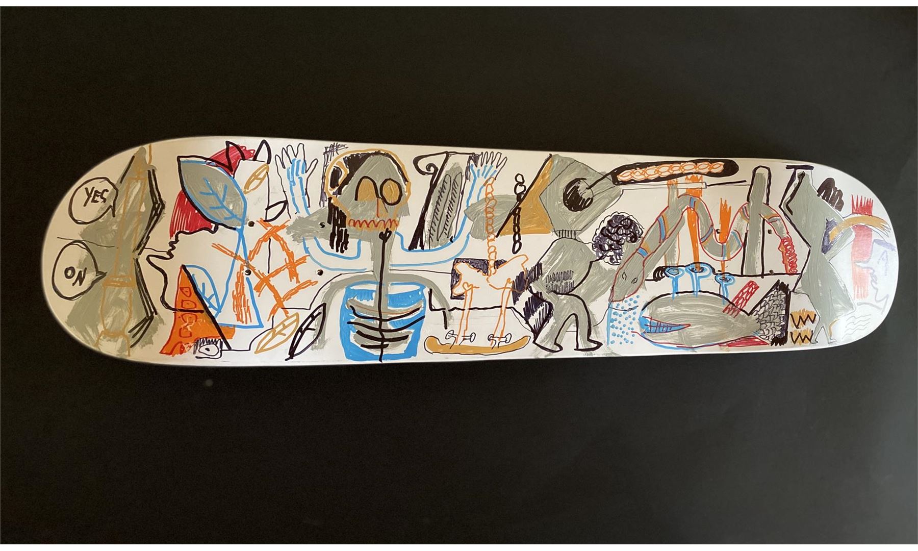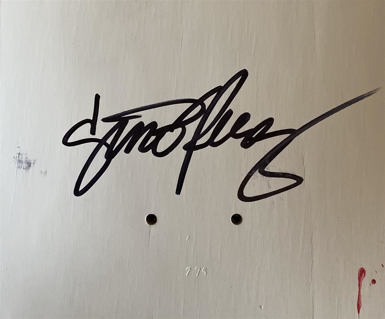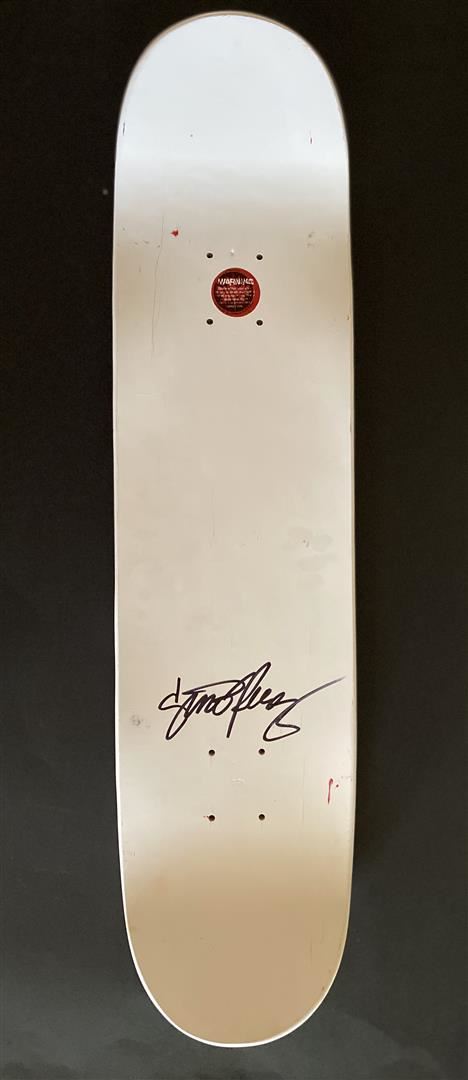 Mortality by Gino Perez. "Mortality" is a wood Sugar Skate Co deck, with hand painted original artwork by Gino Perez, and hand signed. Measures approximately 31.5" x 7.75". Year: 2019. Never mounted or displayed.