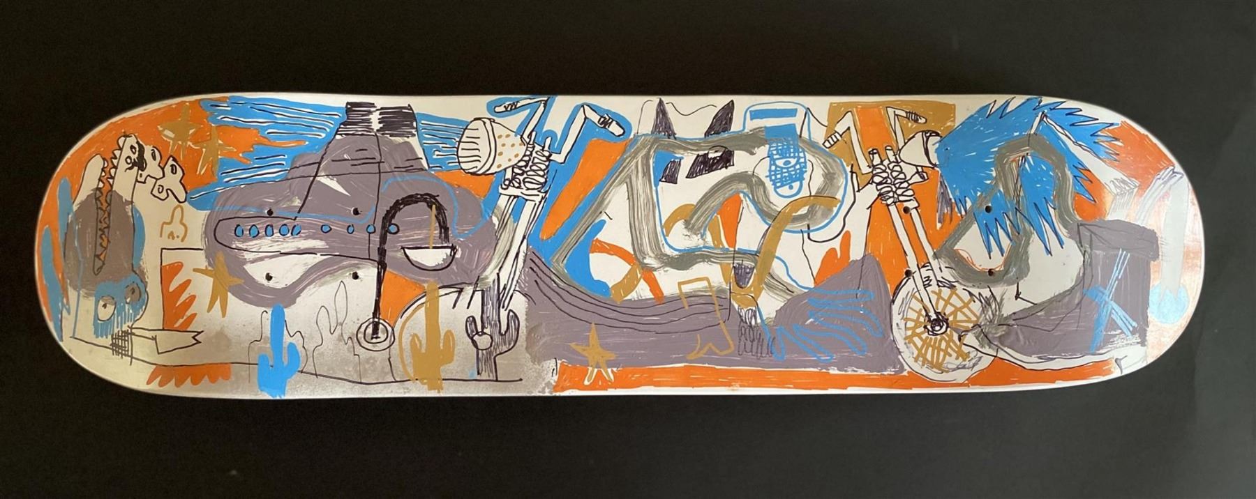 New Life by Gino Perez. "New Life" is a wood Sugar Skate Co deck, with hand painted original artwork by Gino Perez, and hand signed. Measures approximately 31.5" x 7.75". Year 2019. Never mounted or displayed.