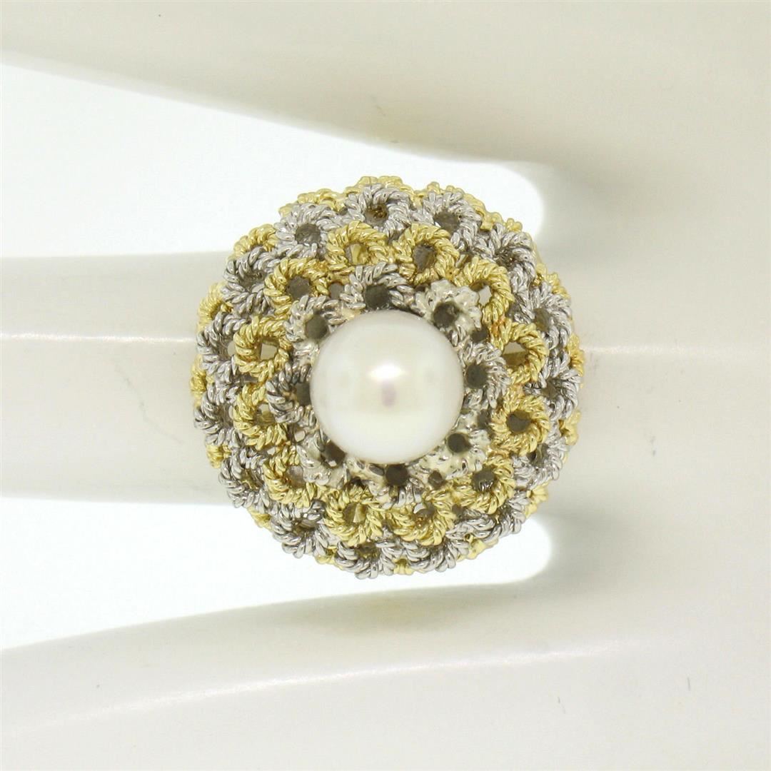 A like new handmade 18k yellow and white gold ring set with a 7.5mm round pearl. The ring is size 6.5, weighs a total of 8.4 grams, and measures 19.75mm wide.