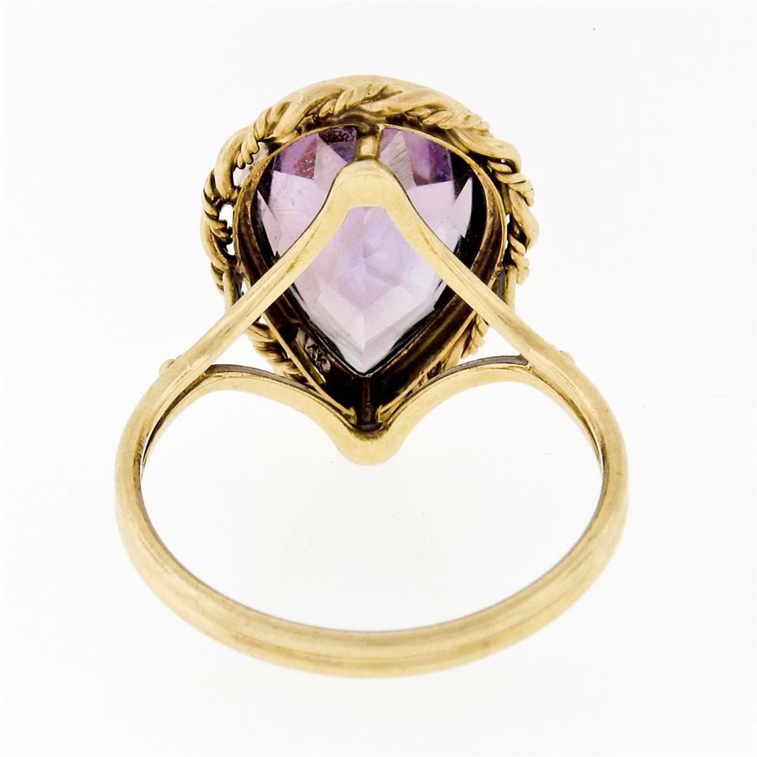A vintage solid 14k yellow gold ring, with 1 pear cut natural amethyst (15.0x10.0mm - 5.50ctw ). The ring is size 7, weighs a total of 3.58 grams, and measures 18.50mm wide.