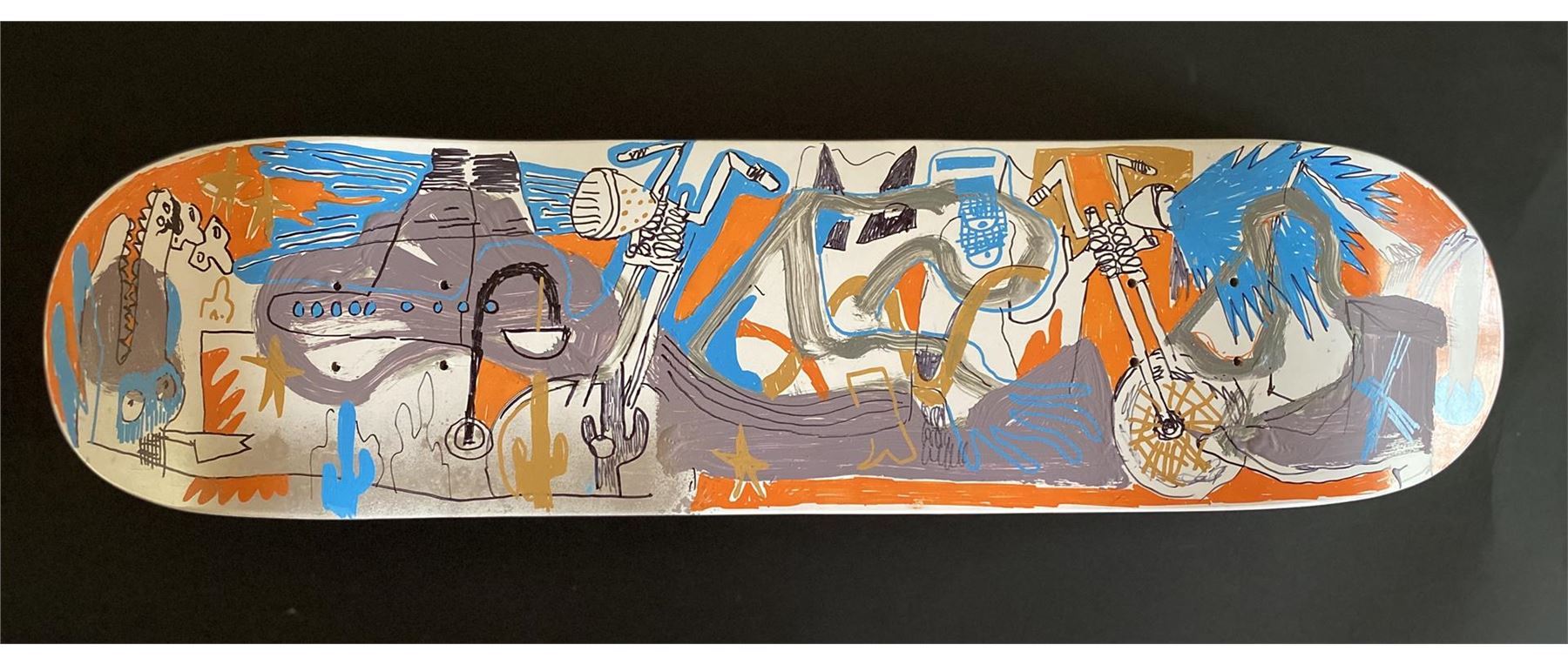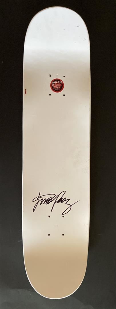New Life by Gino Perez. "New Life" is a wood Sugar Skate Co deck, with hand painted original artwork by Gino Perez, and hand signed. Measures approximately 31.5" x 7.75". Year 2019. Never mounted or displayed.