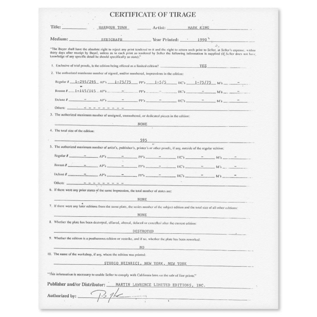 "Harbor Town" is a limited edition serigraph on paper by Mark King (1931-2014). Hand signed and numbered, this piece comes with a letter of authenticity and measures approximately 24" x 32" (image).