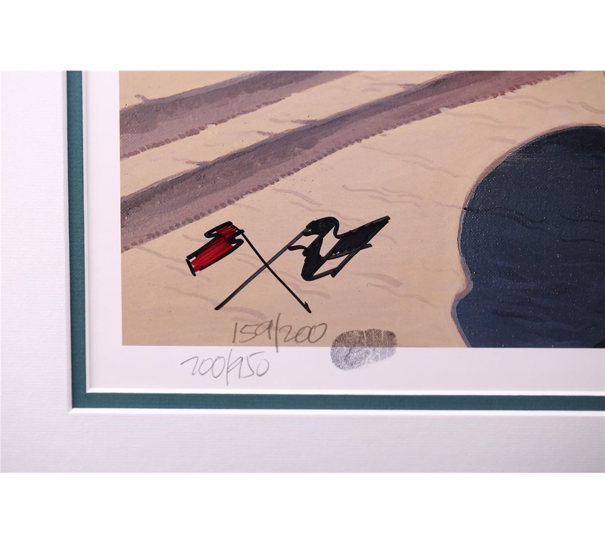 Limited Edition Lithograph #700 of 950 with Harold James Cleworth Original Signature and special 159 of 200 edition with vintage enhanced artist's actual thumbprint and original hand sketched re-marking with a Chevy Logo. Original Harold James Cleworth paintings have sold for over $100,000!! Harold James Cleworth was born in the industrial North of England during WWII. After graduating Manchester College of Art in 1967, he moved to London to work for Decca Records illustrating the first album covers for the Rolling Stones, The Who and other new groups. In 1972, he moved to California choosing automobiles as the new subject. The Chase Manhattan Bank of Zurich bought his first original and private collectors began to commission him to paint portraits of their Bugattis, Duesenbergs and Ferraris. Galleries invited him to exhibit in San Francisco, Santa Monica, Beverly Hills and Carmel. The dimensions are 34 inches by 41 inches. Comes with Certificate of Authenticity.