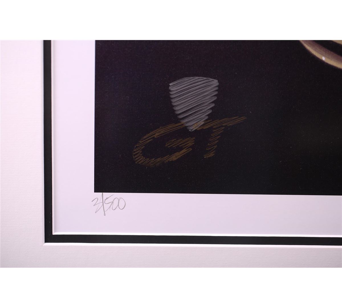 Limited Edition Lithograph #3 of 500 with Harold James Cleworth Original Signature and vintage enhanced artist's actual thumbprint. Original hand sketched re-marking with the GT logo. Original Harold James Cleworth paintings have sold for over $100,000!! Harold James Cleworth was born in the industrial North of England during WWII. After graduating Manchester College of Art in 1967, he moved to London to work for Decca Records illustrating the first album covers for the Rolling Stones, The Who and other new groups. In 1972, he moved to California choosing automobiles as the new subject. The Chase Manhattan Bank of Zurich bought his first original and private collectors began to commission him to paint portraits of their Bugattis, Duesenbergs and Ferraris. Galleries invited him to exhibit in San Francisco, Santa Monica, Beverly Hills and Carmel. The dimensions are 34 inches by 41 inches. Comes with Certificate of Authenticity.