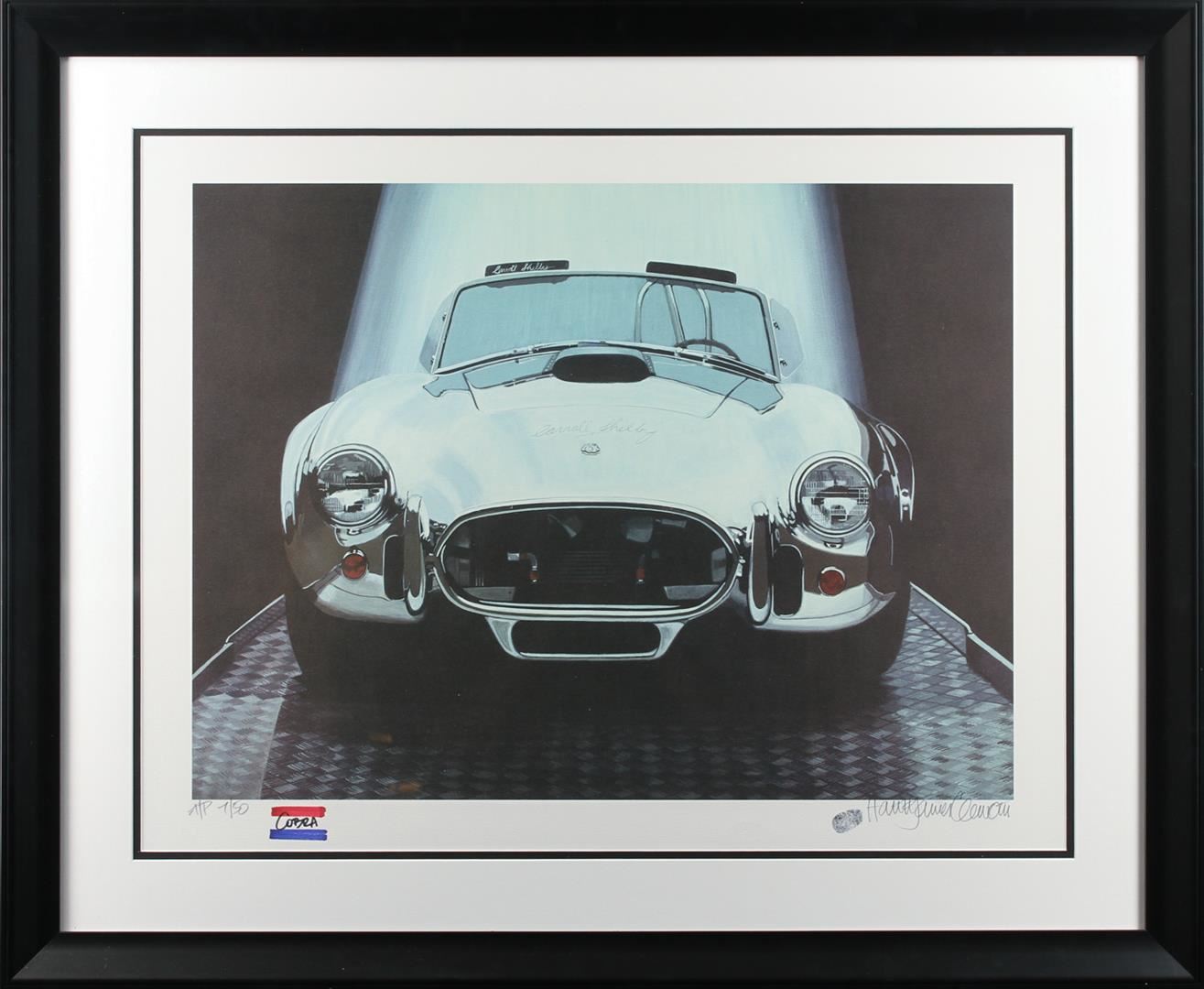 Special Artist's Proof Limited Edition Lithograph #7 of 50 with Harold James Cleworth Original Signature with vintage enhanced artist's actual thumbprint and original hand sketched re-marking with a Cobra Logo. Original Harold James Cleworth paintings have sold for over $100,000!! Harold James Cleworth was born in the industrial North of England during WWII. After graduating Manchester College of Art in 1967, he moved to London to work for Decca Records illustrating the first album covers for the Rolling Stones, The Who and other new groups. In 1972, he moved to California choosing automobiles as the new subject. The Chase Manhattan Bank of Zurich bought his first original and private collectors began to commission him to paint portraits of their Bugattis, Duesenbergs and Ferraris. Galleries invited him to exhibit in San Francisco, Santa Monica, Beverly Hills and Carmel. The dimensions are 41 inches by 34 inches. Comes with Certificate of Authenticity.