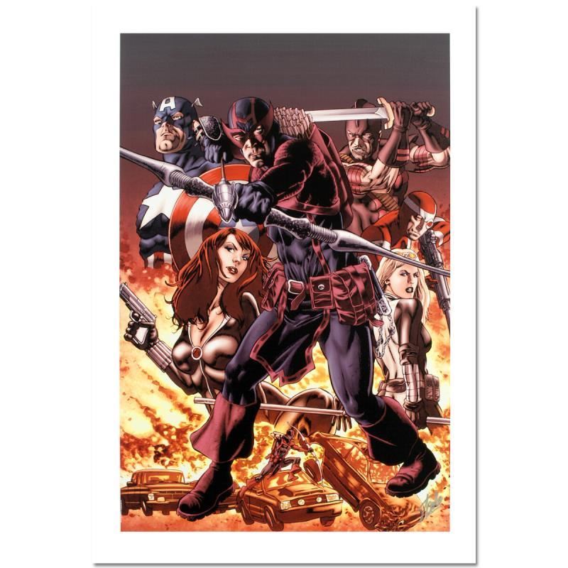 "Hawkeye: Blind Spot #1" is a limited edition giclee on canvas with art by Mike Perkins. Officially licensed by Marvel, this piece is numbered 2/10 and hand signed by creative legend Stan Lee (1922-2018). The piece comes with a certificate of authenticity. Please note the piece has a couple very small imperfection in center visible under close inspection, but generally displays fine. Measures approximately 27" x 18".