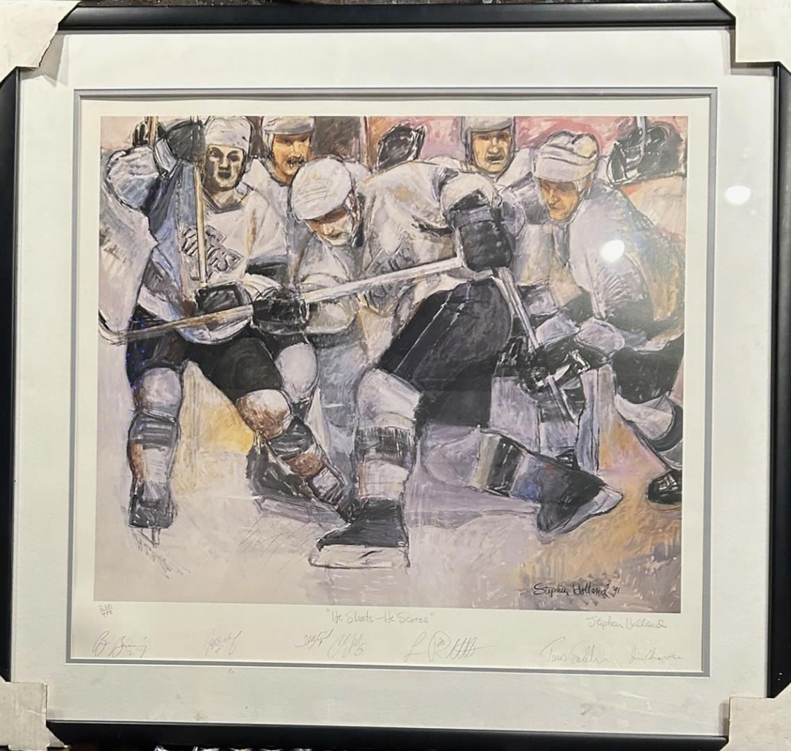 "He Shoots, He Scores", signed by 7 Kings in 1988, framed 23" x 27.5" Litho 220/400 by Stephen Holland 220/400, frame: 34.75" x 37.25", w/COA