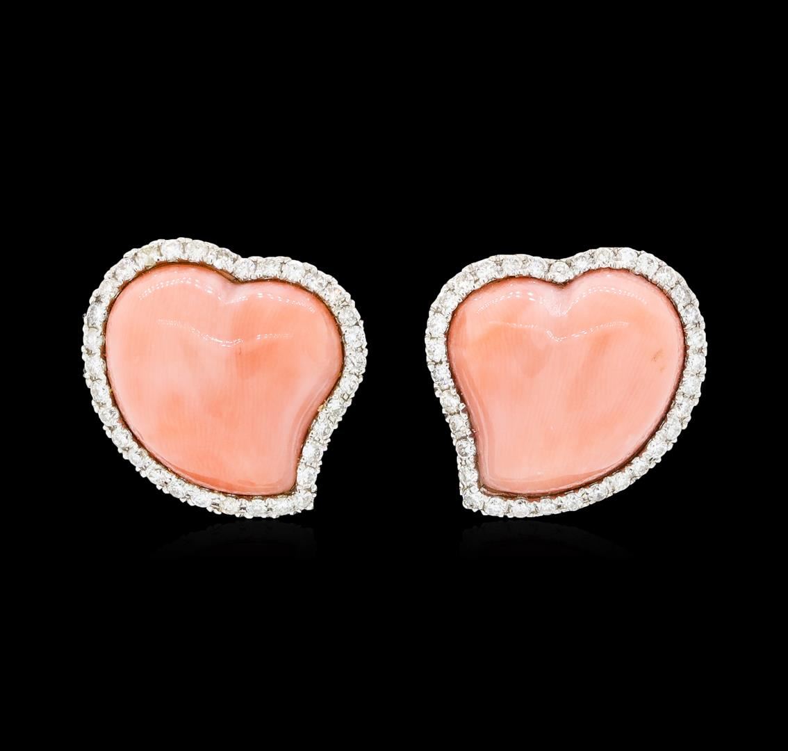 One pair of lady's heart shaped earrings featuring: 18KT white gold weighing 7.1 grams containing two pieces of heart shaped coral and diamonds weighing 0.45ctw.