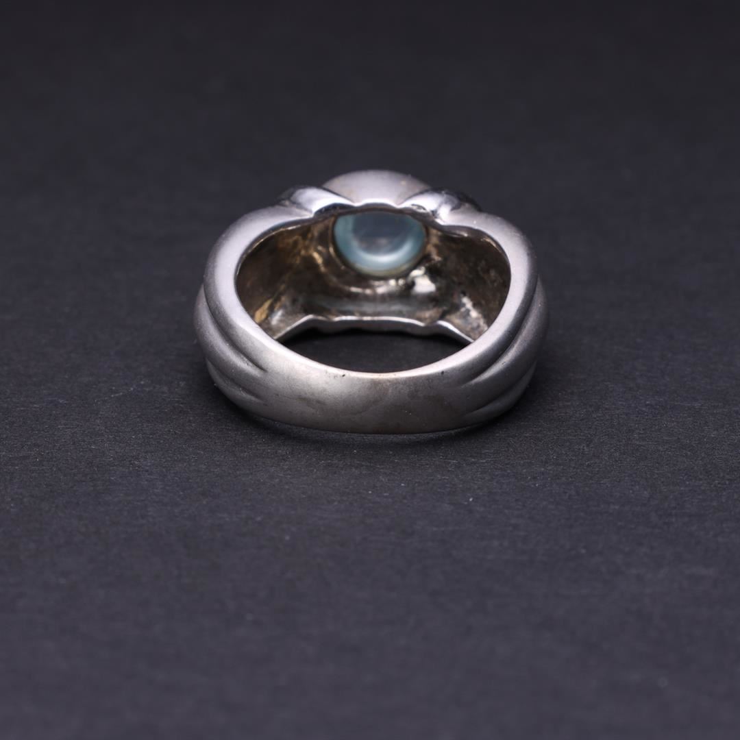Heavy 18K White Gold & Blue Aqua Marine Cabochon Ring containing one aqua marine weighing approximately 0.70 cts. Total weight of ring is 11.2 gm. Estimated retail value $3,500.