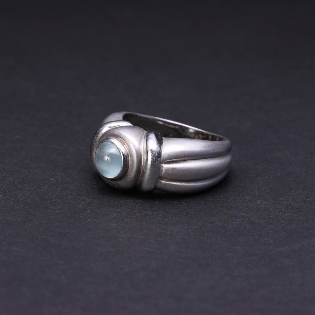 Heavy 18K White Gold & Blue Aqua Marine Cabochon Ring containing one aqua marine weighing approximately 0.70 cts. Total weight of ring is 11.2 gm. Estimated retail value $3,500.