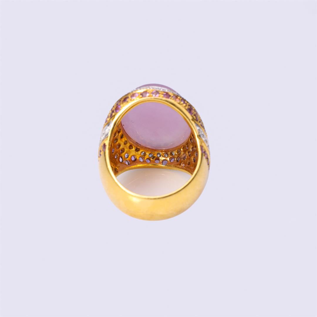 A heavy 18k yellow gold, diamond, amethyst and lavender jadeite cabochon ring, marked 18k, by designer Victor Loo; the jadeite set within a border bezel of full cut diamonds with additional diamond plus amethyst rows to the shoulders; gross weight 17.9 g,