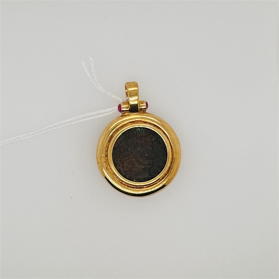 Heavy 18k yellow gold pendant with rubies and Imperial Roman copper coin, stamped 18k; patina to coin commensurate with age, gross weight 16.4 g, 1 3/4" x 1 1/4" (approx.)