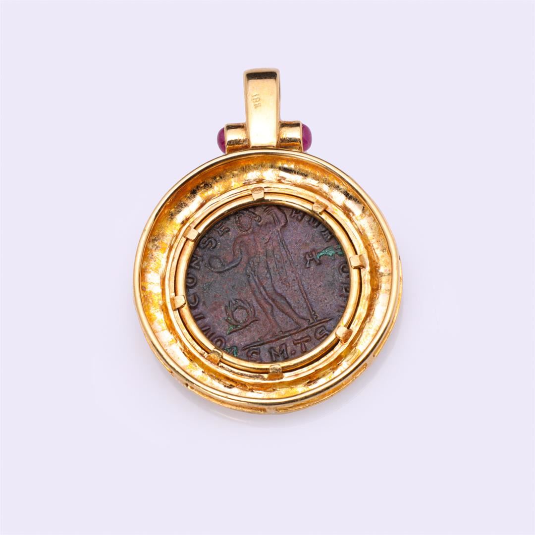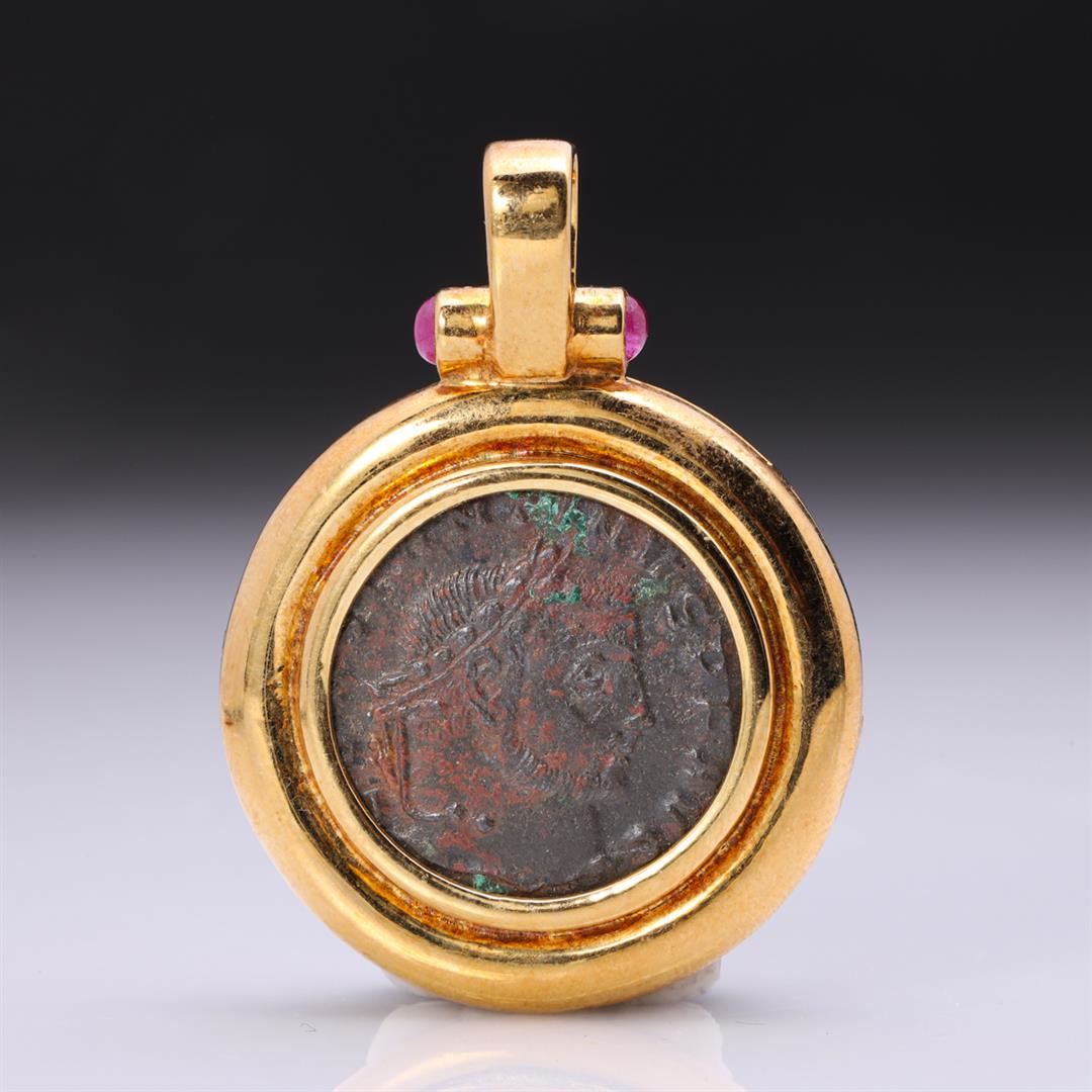Heavy 18K Yellow Gold Pendant With Rubies & Imperial Roman Copper Coin containing two rubies weighing approximately 0.20 cts Total weight is 16.3 gm. Estimated retail value $3,600.