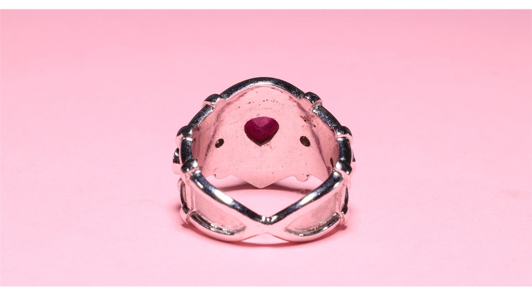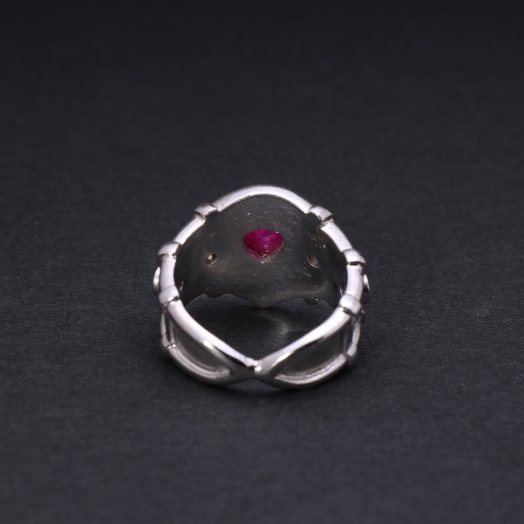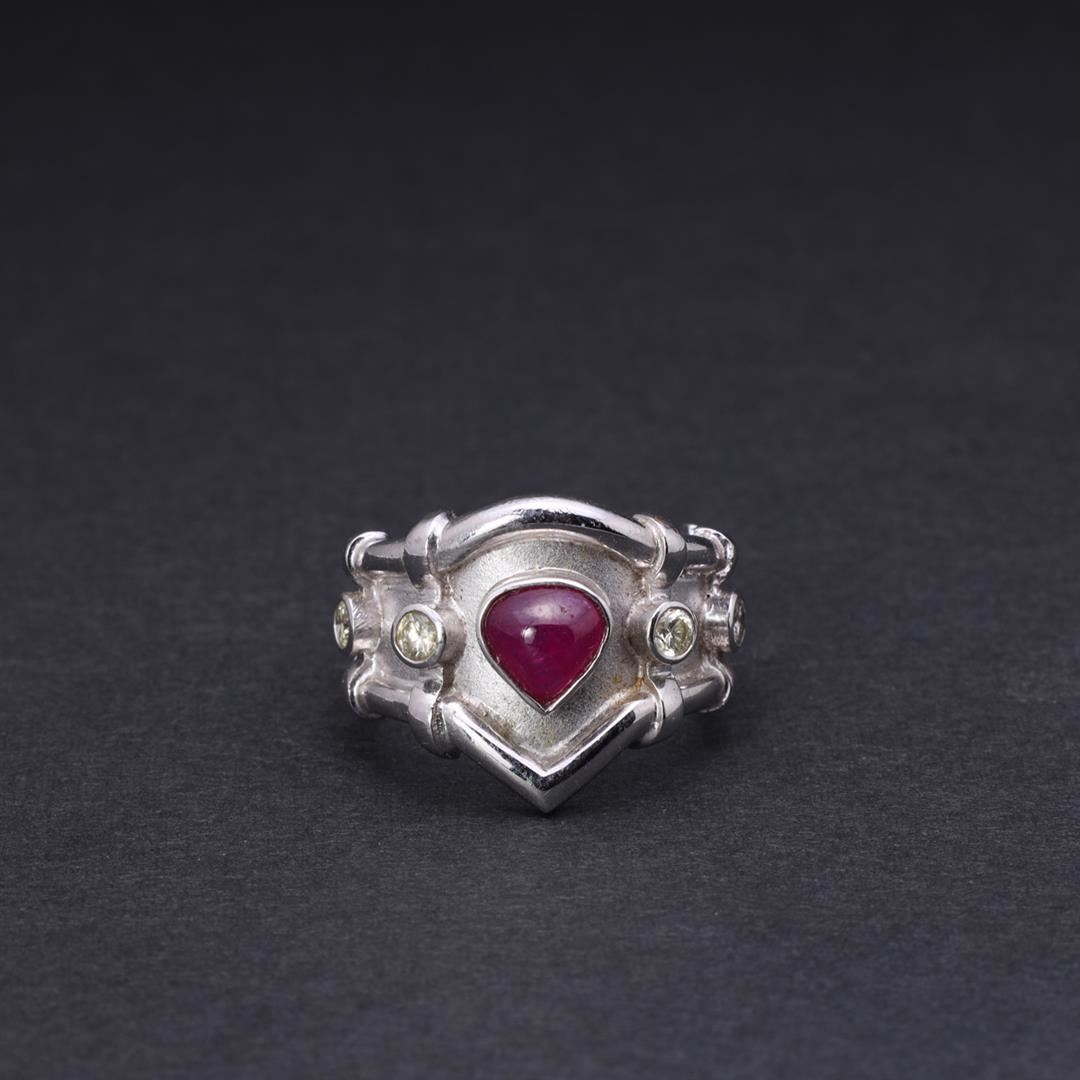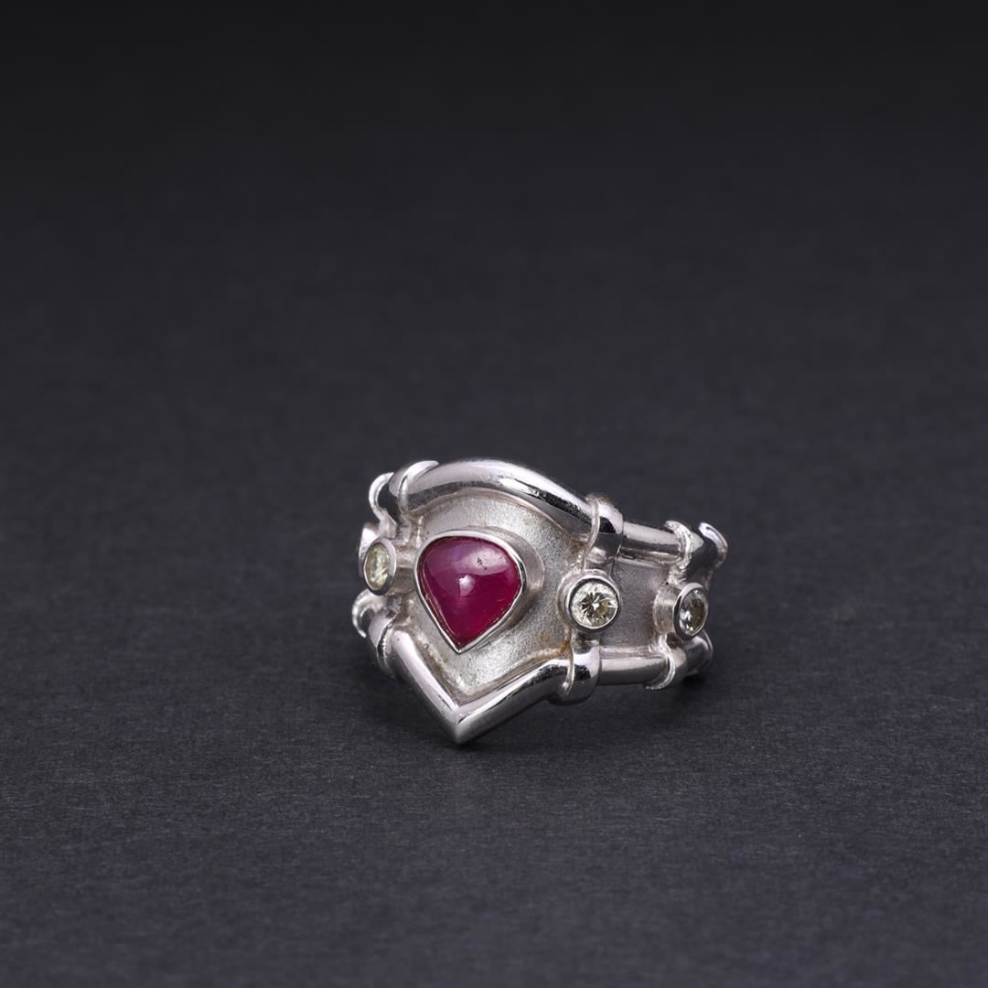 Heavy 18k white gold elaborate ring; teardrop ruby cabochon set in a wide recessed band with two round diamond accents to each shoulder 750 to interior; gross weight 14.1 g, size 7 3/4