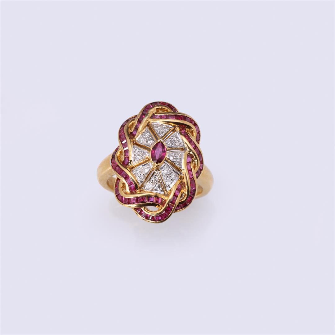 18k Yellow Gold Ruby & Diamond Art Deco Style Ring containing rubies weighing approximately 1.20 cts. Twenty four brilliant cut round diamonds weighing approximately 0.20 cts. Total weight of ring is 8 gm. Estimated retail value $3,200.