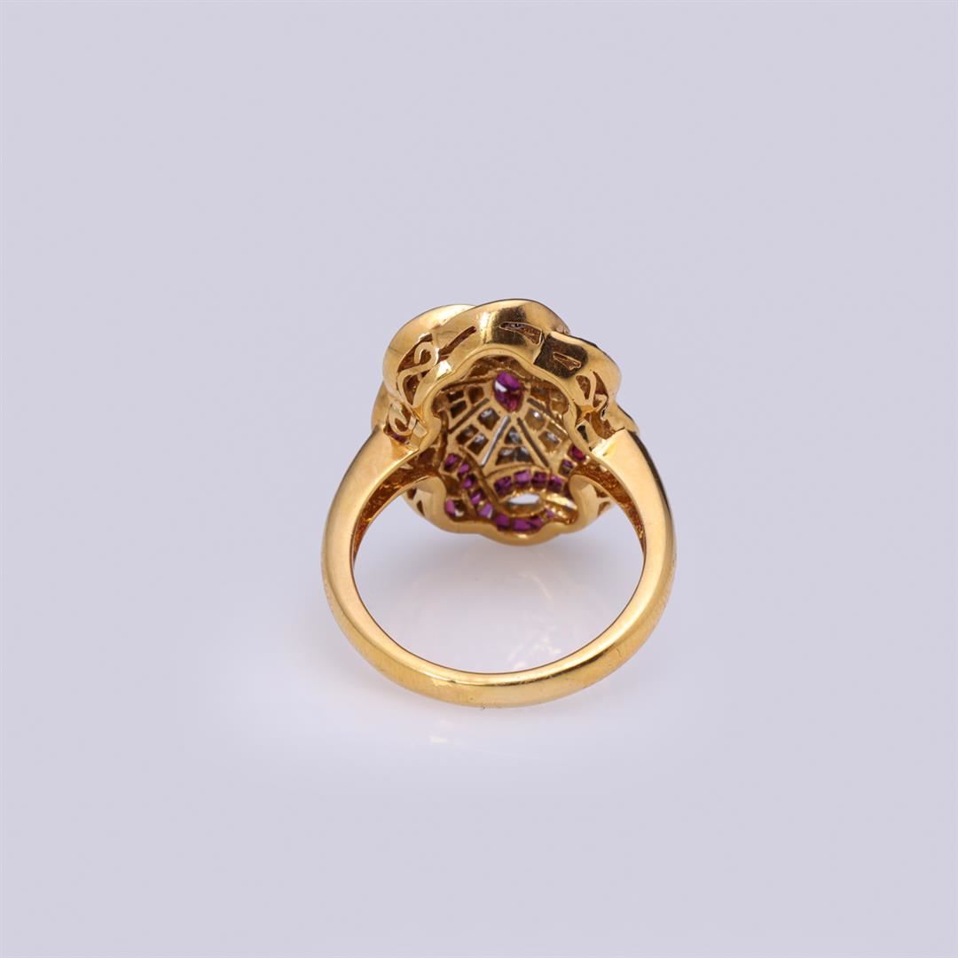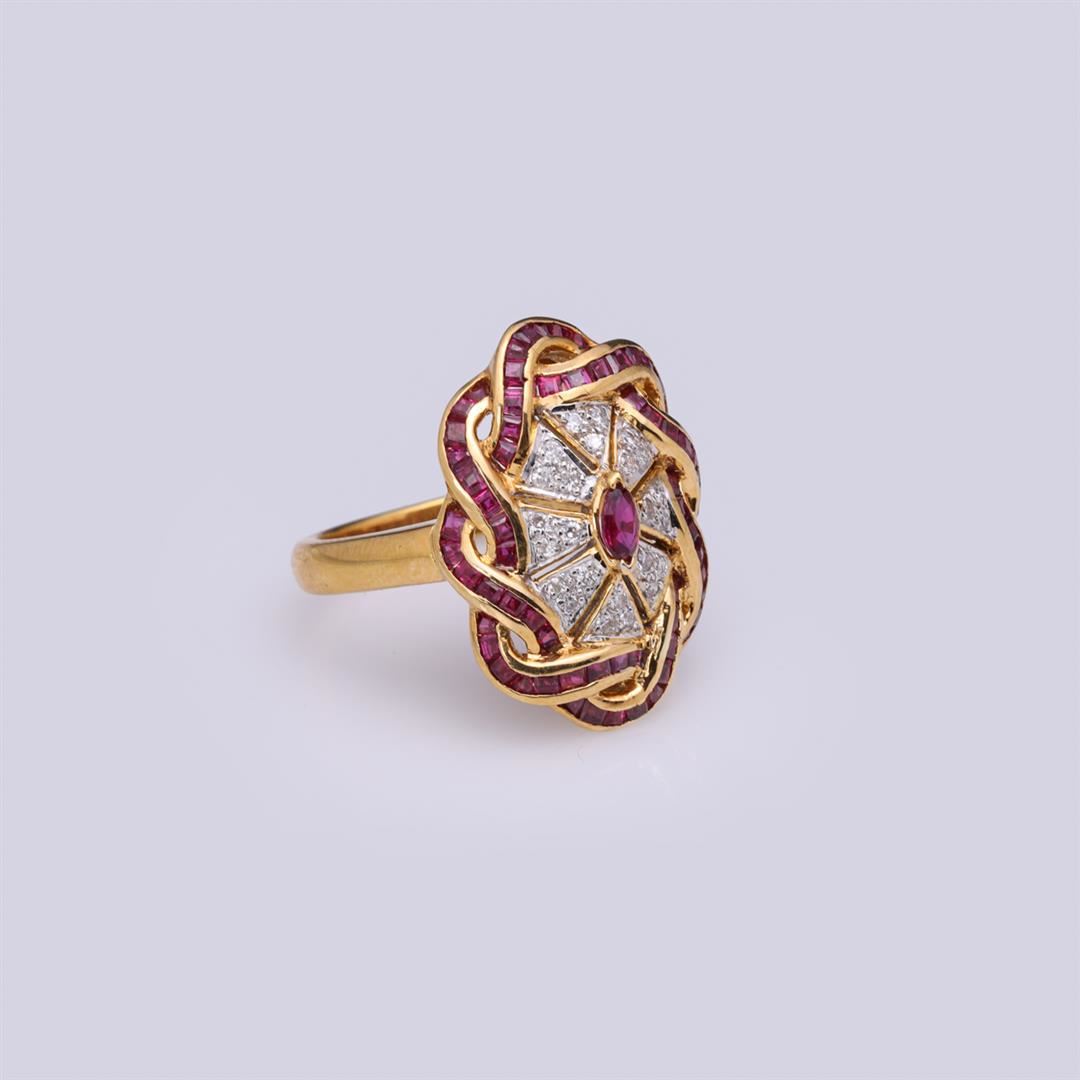 18k Yellow Gold Ruby & Diamond Art Deco Style Ring containing rubies weighing approximately 1.20 cts. Twenty four brilliant cut round diamonds weighing approximately 0.20 cts. Total weight of ring is 8 gm. Estimated retail value $3,200.