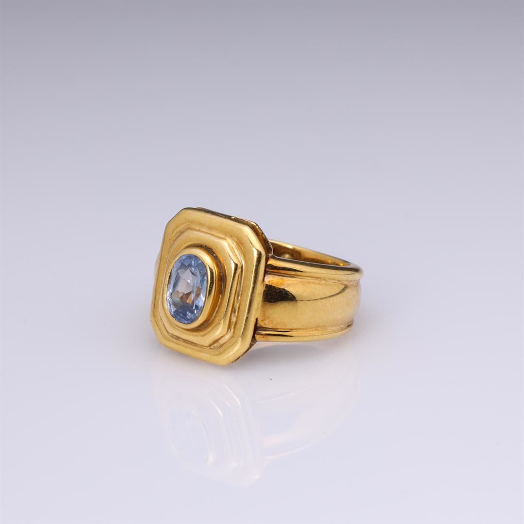 Heavy 18k yellow gold ring; bezel set with possiblly Ceylon sapphire, marked 18k to interior band; overall good condition; gross weight 14.9 g, size 7 3/4