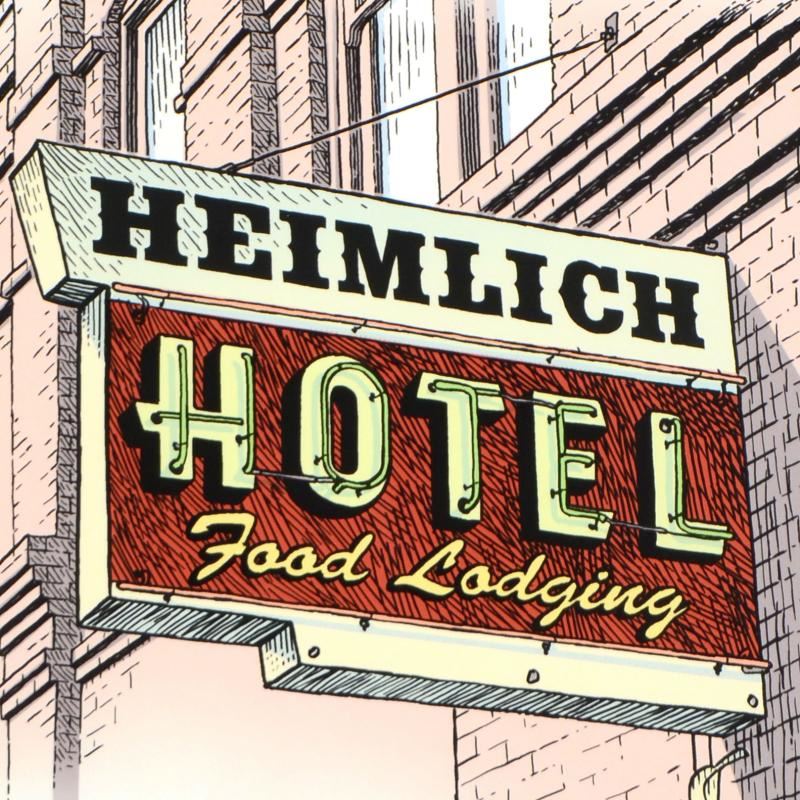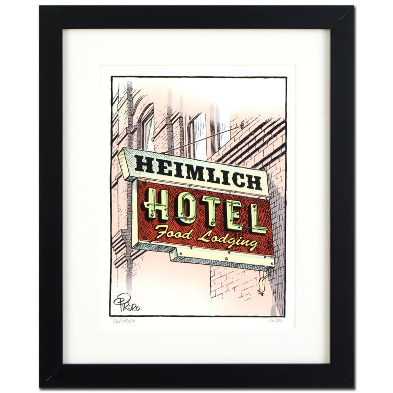 Enter a surreal and satirical world of twisted imagination and award winning creativity. "Heimlich Hotel" is a limited edition giclee on paper by Dan Piraro, creator of the critically acclaimed and award winning comic strip, Bizarro! This piece is framed, numbered and hand signed by the artist! Includes Certificate of Authenticity! Measures approx. 16.5" x 20" (with frame), 9" x 12.5" (image).