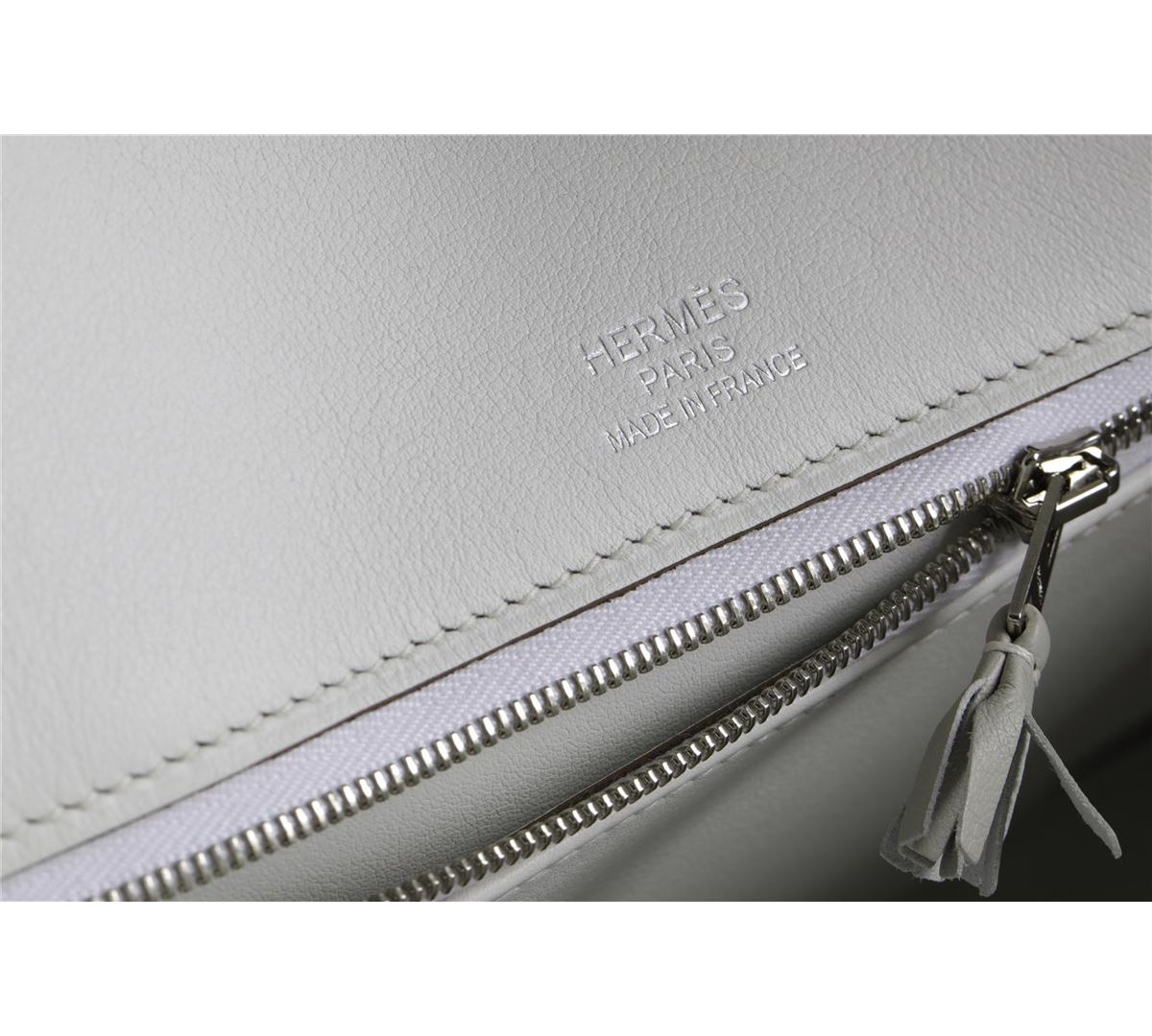 This is a very special Limited Edition Kelly. This two-tone 35cm Ghillies Kelly is crafted from White and Gris Perle Swift leather. The simple and understated color combination is accented by Palladium hardware for an elegant finish. The interior is White Swift leather with one zip pocket and two slip pockets. This is a beautifully feminine and chic addition to anyone's wardrobe. This bag is in Pristine Condition. It has plastic protection on the hardware and comes with a Hermes dustbag, care card, rain protector, ribbon, and box. This bag also includes a lock, keys, and clochette. 14" Width x 10" Height x 7" Depth.