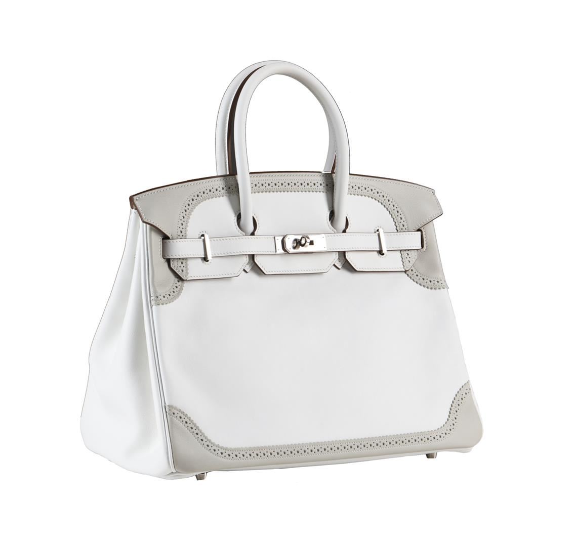 This is a very special Limited Edition Kelly. This two-tone 35cm Ghillies Kelly is crafted from White and Gris Perle Swift leather. The simple and understated color combination is accented by Palladium hardware for an elegant finish. The interior is White Swift leather with one zip pocket and two slip pockets. This is a beautifully feminine and chic addition to anyone's wardrobe. This bag is in Pristine Condition. It has plastic protection on the hardware and comes with a Hermes dustbag, care card, rain protector, ribbon, and box. This bag also includes a lock, keys, and clochette. 14" Width x 10" Height x 7" Depth.