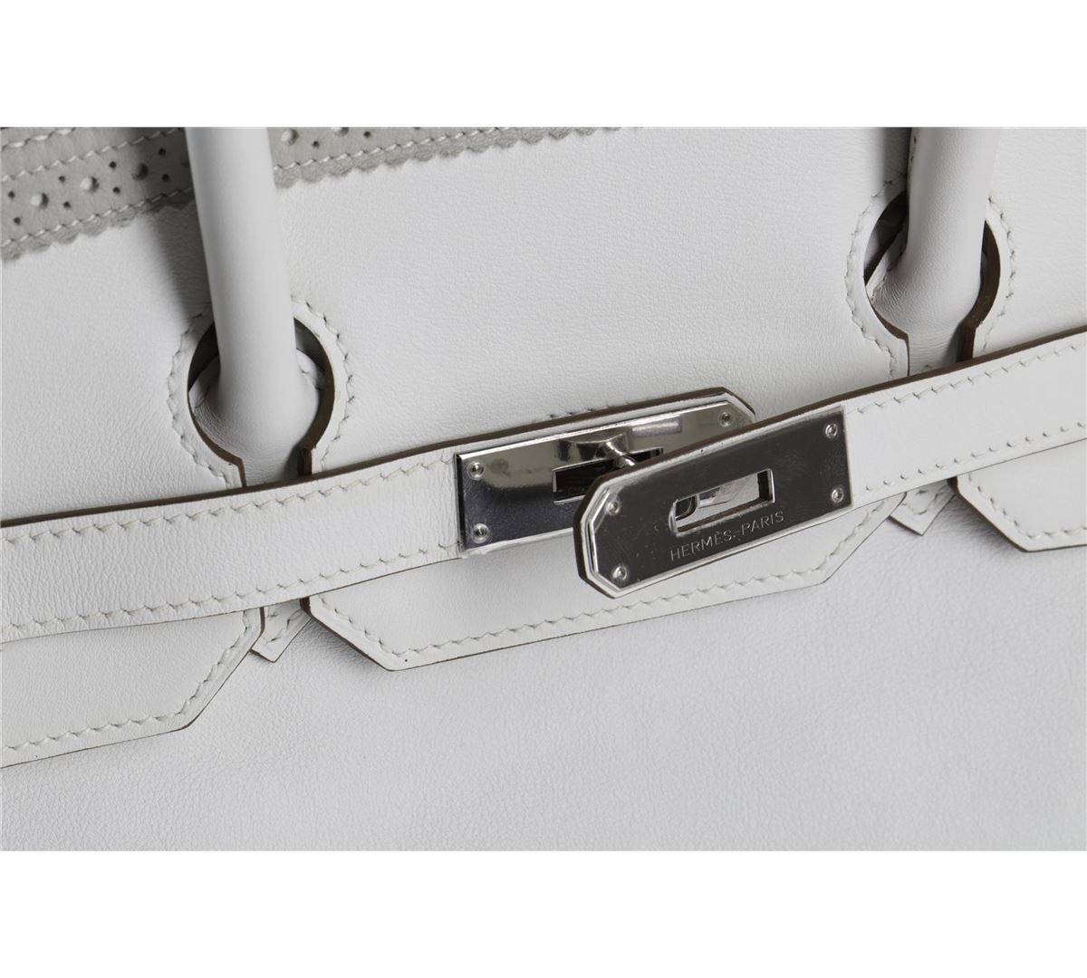 This is a very special Limited Edition Kelly. This two-tone 35cm Ghillies Kelly is crafted from White and Gris Perle Swift leather. The simple and understated color combination is accented by Palladium hardware for an elegant finish. The interior is White Swift leather with one zip pocket and two slip pockets. This is a beautifully feminine and chic addition to anyone's wardrobe. This bag is in Pristine Condition. It has plastic protection on the hardware and comes with a Hermes dustbag, care card, rain protector, ribbon, and box. This bag also includes a lock, keys, and clochette. 14" Width x 10" Height x 7" Depth.