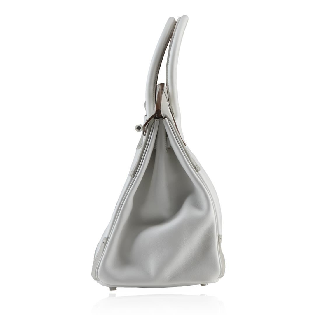 This is a very special Limited Edition Kelly. This two-tone 35cm Ghillies Kelly is crafted from White and Gris Perle Swift leather. The simple and understated color combination is accented by Palladium hardware for an elegant finish. The interior is White Swift leather with one zip pocket and two slip pockets. This is a beautifully feminine and chic addition to anyone's wardrobe. This bag is in Pristine Condition. It has plastic protection on the hardware and comes with a Hermes dustbag, care card, rain protector, ribbon, and box. This bag also includes a lock, keys, and clochette. 14" Width x 10" Height x 7" Depth.