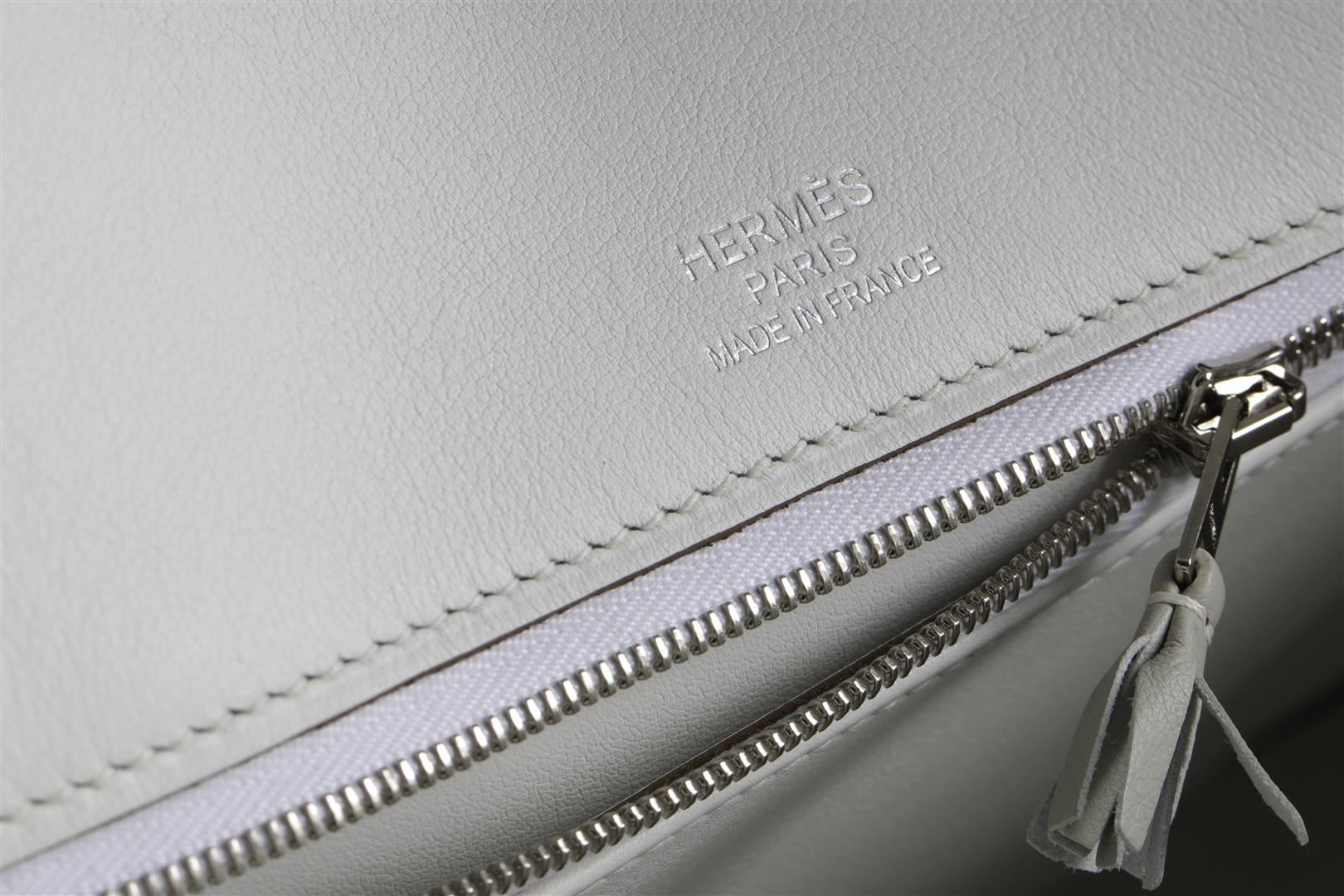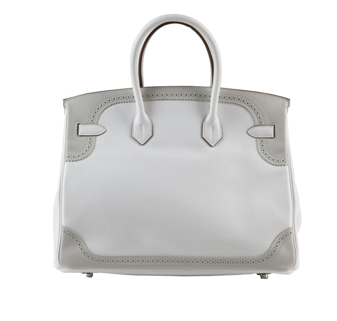 This is a very special Limited Edition Kelly. This two-tone 35cm Ghillies Kelly is crafted from White and Gris Perle Swift leather. The simple and understated color combination is accented by Palladium hardware for an elegant finish. The interior is White Swift leather with one zip pocket and two slip pockets. This is a beautifully feminine and chic addition to anyone's wardrobe. This bag is in Pristine Condition. It has plastic protection on the hardware and comes with a Hermes dustbag, care card, rain protector, ribbon, and box. This bag also includes a lock, keys, and clochette. 14" Width x 10" Height x 7" Depth.