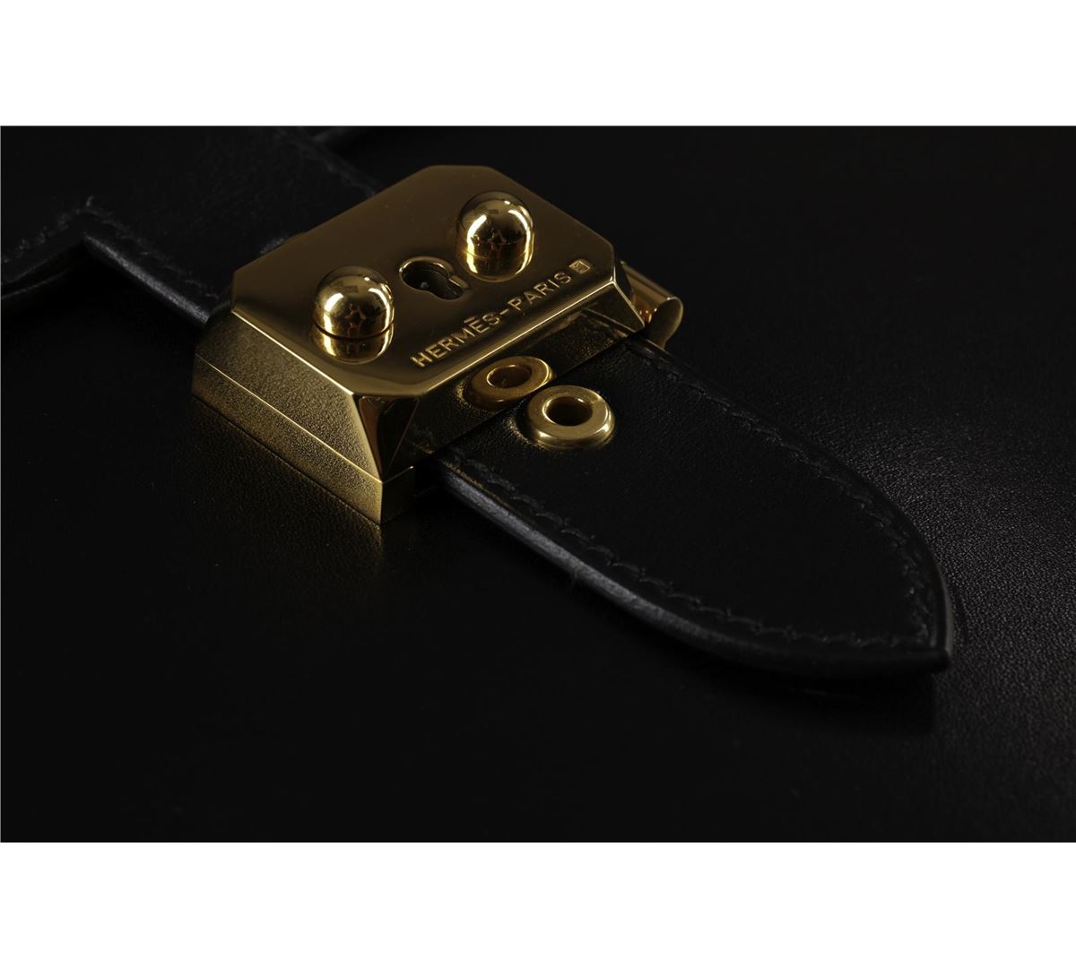 This professional briefcase is perfect for both men and women. The exterior is smooth and sleek Black Calf Box leather with one leather top handle. It features a gold snap closure with an adjustable buckle strap. The interior is matching black leather with two large sections and three smaller sections. This briefcase is in Excellent Condition. There are a few light stray scuff marks to the exterior. 16" Width x 12" Height x 3" Depth.