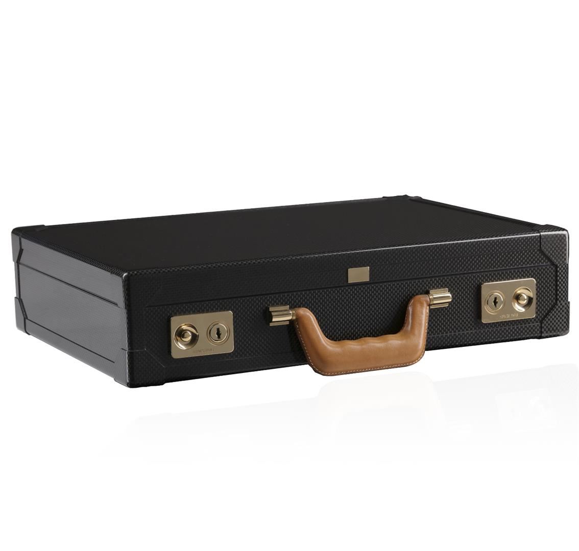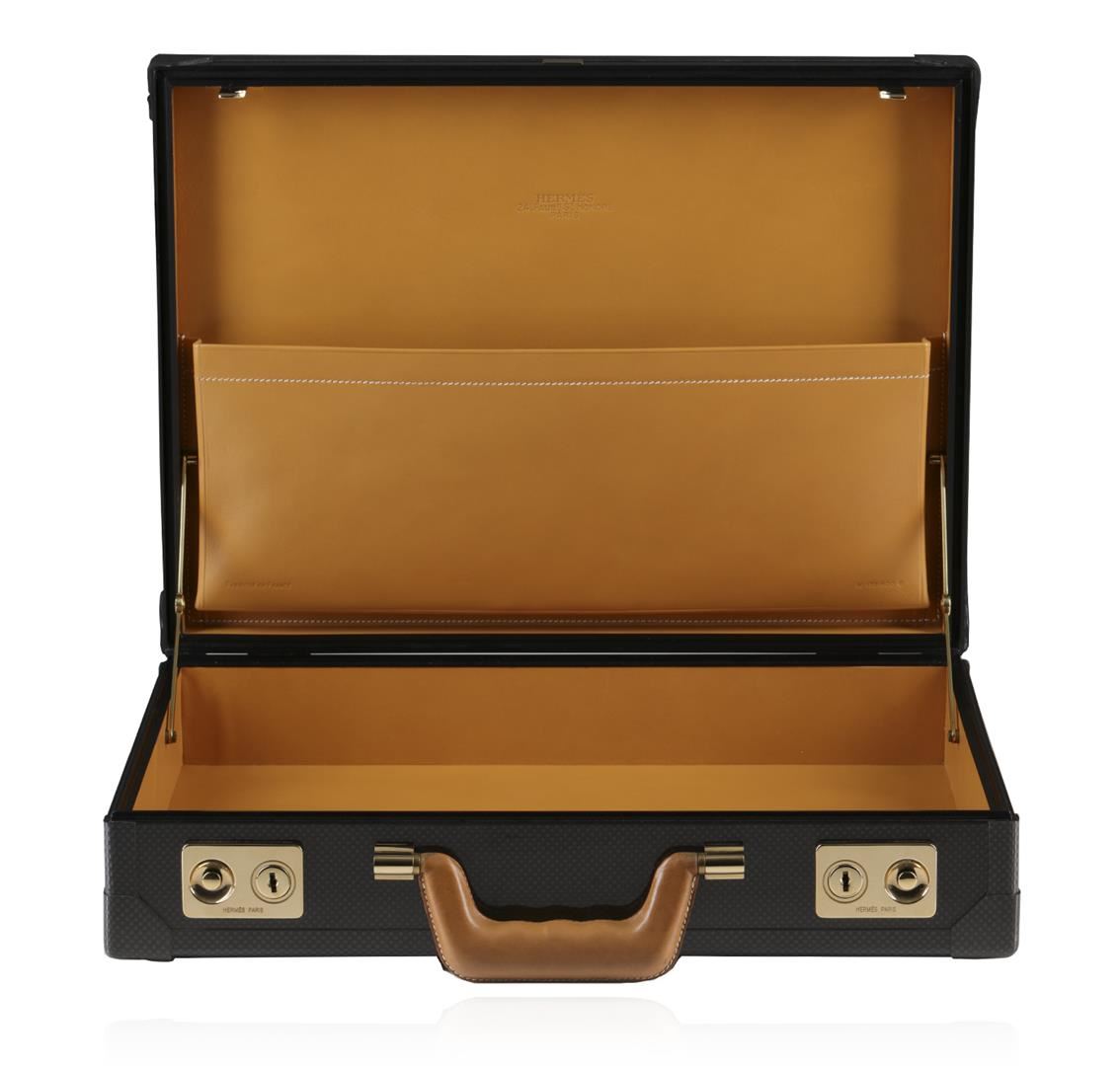 This briefcase is an incredibly special piece. Not only is it made of carbon fiber, a material used very rarely by Hermes, but it is also one of only five hundred that were made, making this such a great collector's item. Whether looking for a functional, beautiful briefcase to use everyday or wanting to build a diverse Hermes collection, this briefcase is a valuable item that you don't see often. The exterior is done in shiny carbon fiber, and it features a Vache Naturelle Leather handle and clochette with gold hardware, locking closure, and keys. The interior is also Vache Naturelle, includes one slip pocket, and is stamped number 172/500. This is a great opportunity to own such a special Hermes piece. This briefcase is in Excellent Condition. There is light wear to the top handle, and the interior shows no wear. This briefcase comes with a dustbag. 16" Width x 12" Height x 4" Depth.