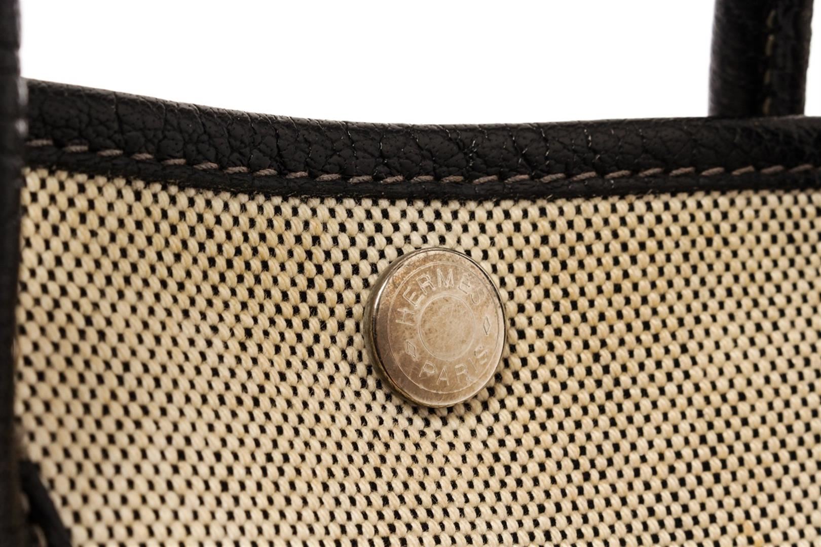 Hermes Beige Canvas Garden Party Tote Bag. All available information is listed in the description and shown in the photos. Hermes Beige Canvas Garden Party Tote Bag with ébène toile h canvas, palladium-plated hardware, negonda leather trim, dual rolled handles, canvas lining, snap closure at front, includes dust bag. Height: 9.5" Width: 14" Depth: 6", Handle Drop: 5" / 24.13 x 35.56 x 15.24 Cm