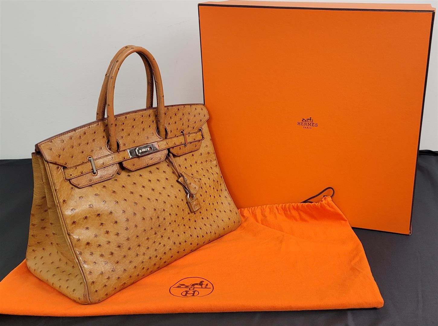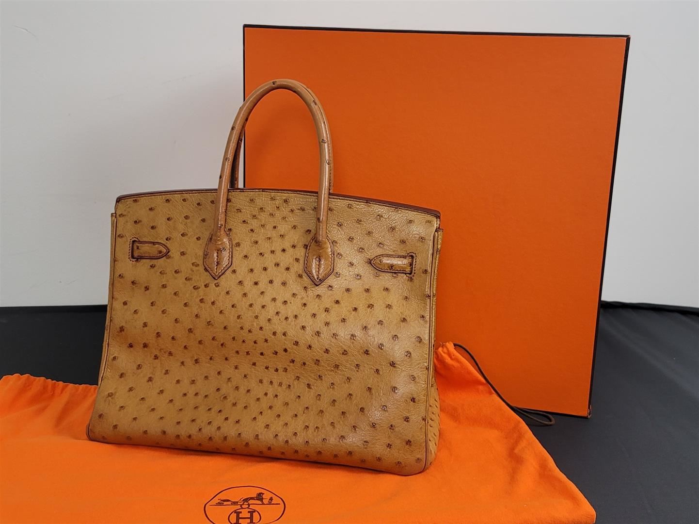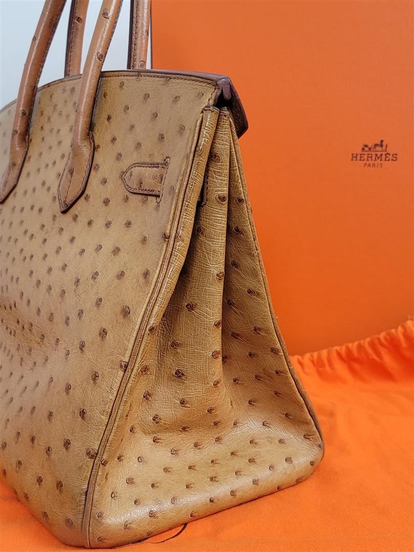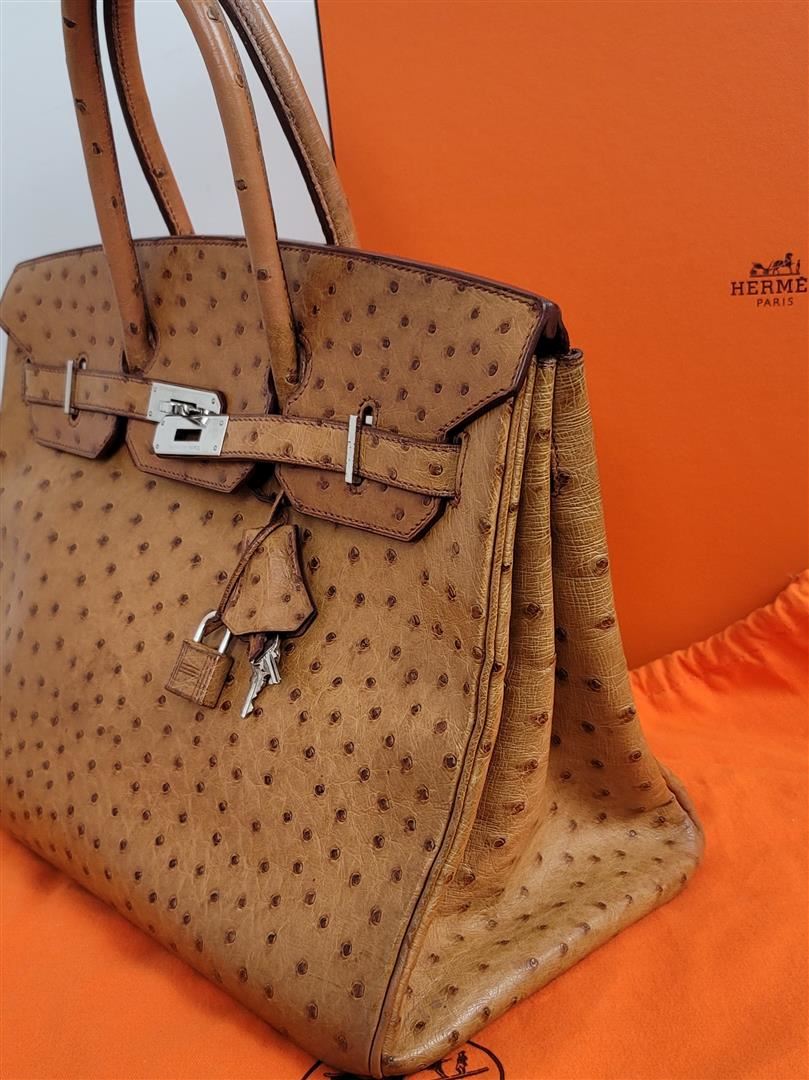 Hermes Birkin 35 featured in Cognac Brown. Hermès 'Birkin 35' bag in Cognac ostrich leather. Lined in Chevre (goat skin) with an open pocket against the front and a zipper pocket against the back. Comes with clochette, keys, lock and dust bag. Height 25cm (9.8in) Width 35cm (13.7in) Depth 17cm (6.6in) Drop of the Handle 10cm (3.9in) Hardware Palladium Blindstamp J in a Square 100% Guaranteed to be Authentic! Comes with a certified Authentication!! CONDITION: This bag is PRE OWNED but in GREAT condition - https://www.bababebi.com/opinion-short/19371