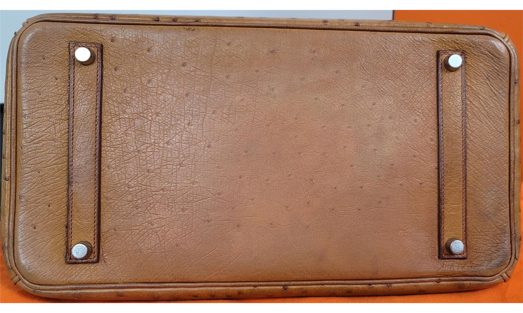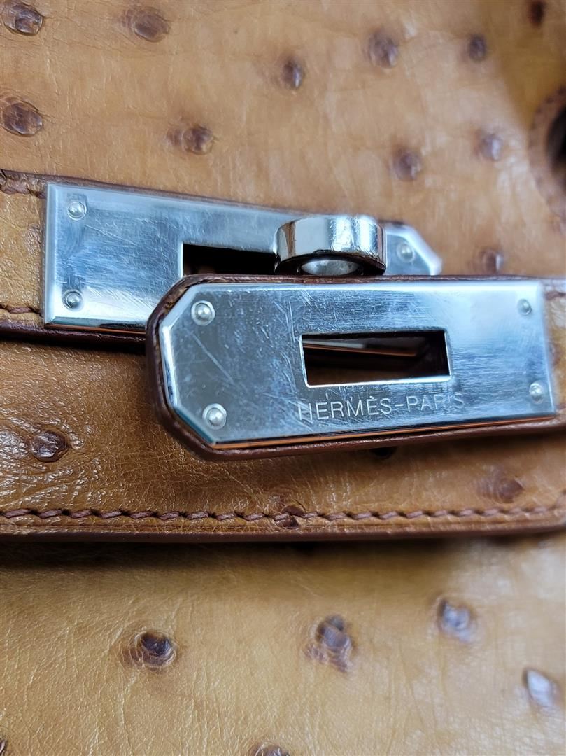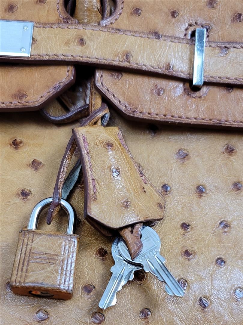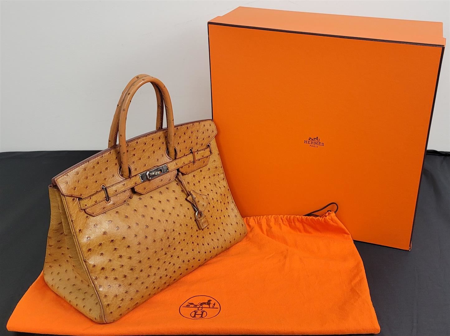 Hermes Birkin 35 featured in Cognac Brown. Hermès 'Birkin 35' bag in Cognac ostrich leather. Lined in Chevre (goat skin) with an open pocket against the front and a zipper pocket against the back. Comes with clochette, keys, lock and dust bag. Height 25cm (9.8in) Width 35cm (13.7in) Depth 17cm (6.6in) Drop of the Handle 10cm (3.9in) Hardware Palladium Blindstamp J in a Square 100% Guaranteed to be Authentic! Comes with a certified Authentication!! CONDITION: This bag is PRE OWNED but in GREAT condition - https://www.bababebi.com/opinion-short/19371