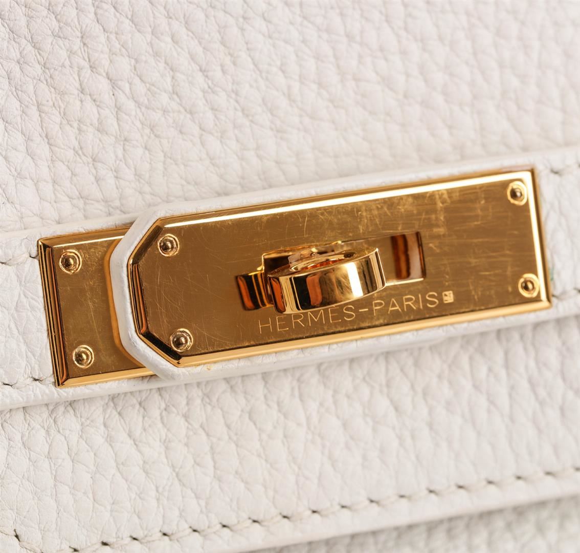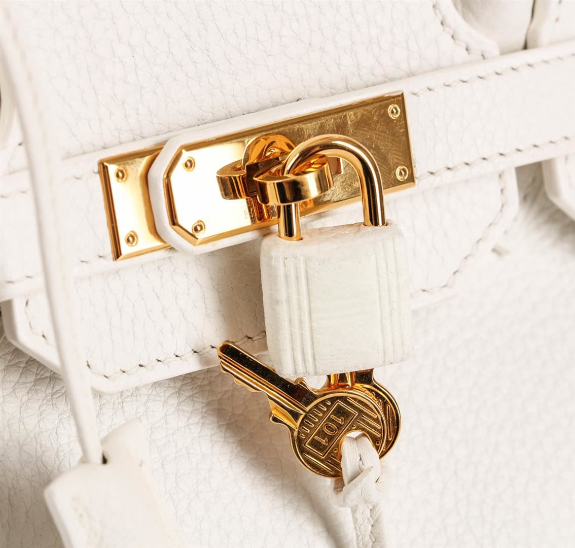 This stunning 100% authentic Hermes Birkin bag is sure to get you noticed. Crafted from leather (craie togo) and features tonal stitching, front toggle closure, clochette with lock and two keys, and double rolled handles. The interior is lined in craie chevre with one zip pocket and one open pocket. Origin: France. Condition: Like new; very minor surface scratches on hardware that can only be seen by looking at it up close. Measurements: 14" wide, 10.5" tall, 4.5" handle drop. Includes original orange Hermes box, dust cover, clochette, clochette dust bag, lock, two keys, Hermes raincoat, and papers. Please note that the Hermes box is slightly torn on one of the corners. The bag itself is in like new condition as described above.