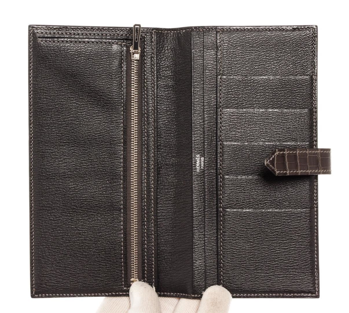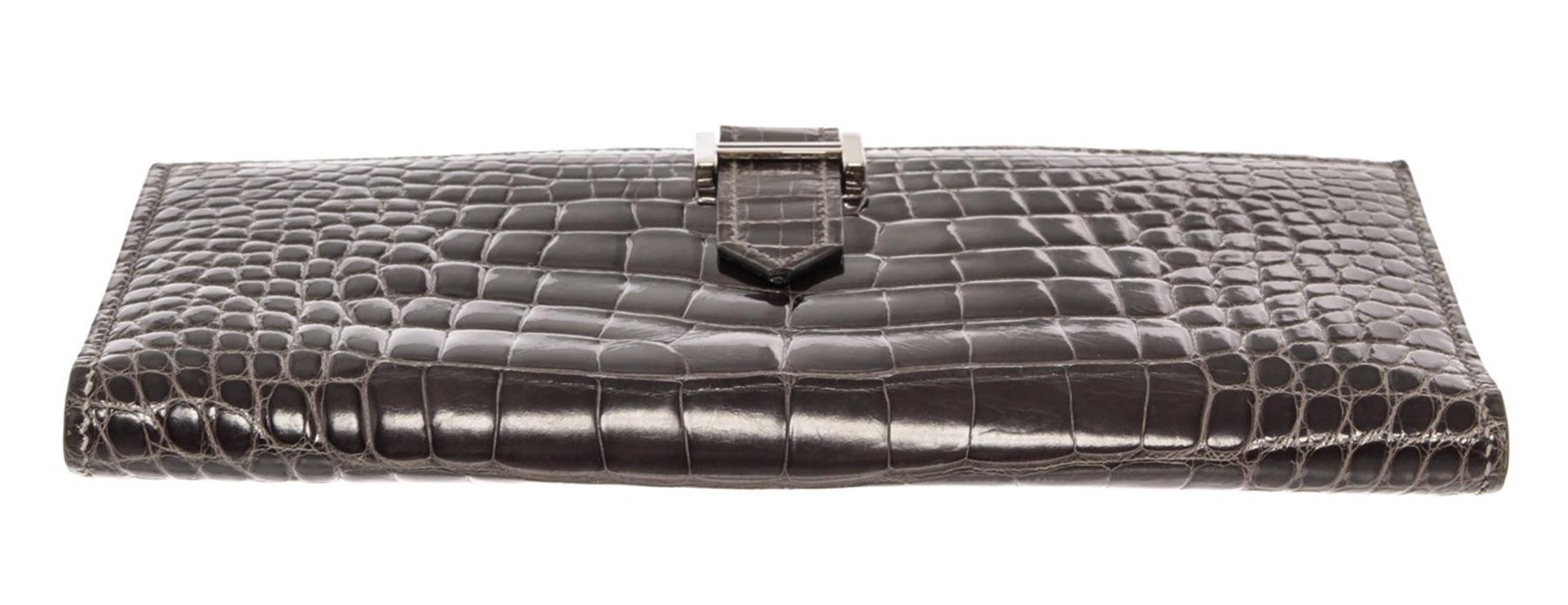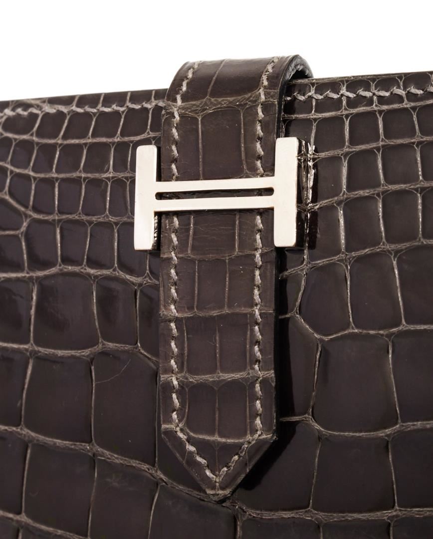 Hermes Black Alligator Leather Bearn Wallet. All available information is listed in the description and shown in the photos. Hermes Bearn Wallet is cone in shiny black Alligator leather, featuring a bifold design and a silver-tone strap closure. The interior is crafter in black Chevre Leather, featuring five card slip pockets, two slip pockets for paper currency, one zip pocket and an additional slip pocket behind. 7" x 3.5" x 0.5"