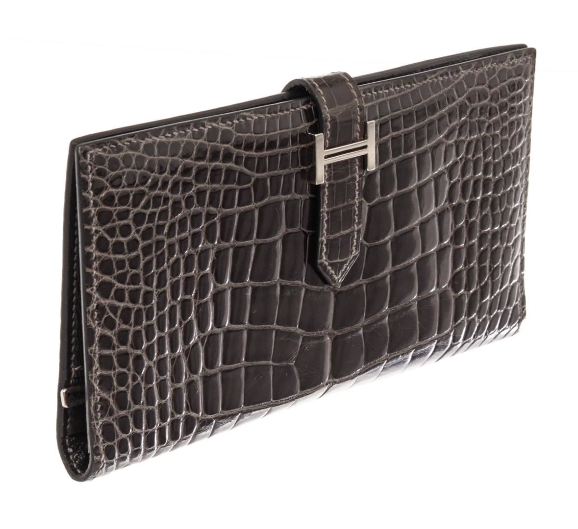 Hermes Black Alligator Leather Bearn Wallet. All available information is listed in the description and shown in the photos. Hermes Bearn Wallet is cone in shiny black Alligator leather, featuring a bifold design and a silver-tone strap closure. The interior is crafter in black Chevre Leather, featuring five card slip pockets, two slip pockets for paper currency, one zip pocket and an additional slip pocket behind. 7" x 3.5" x 0.5"