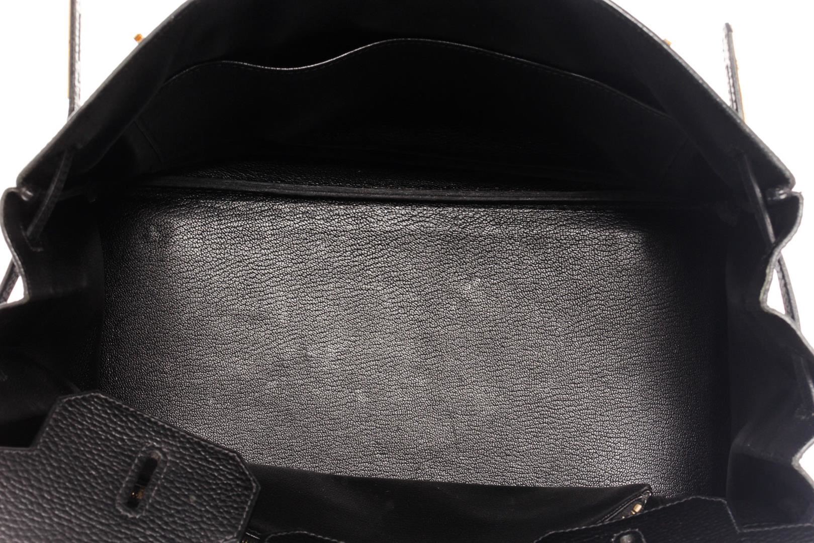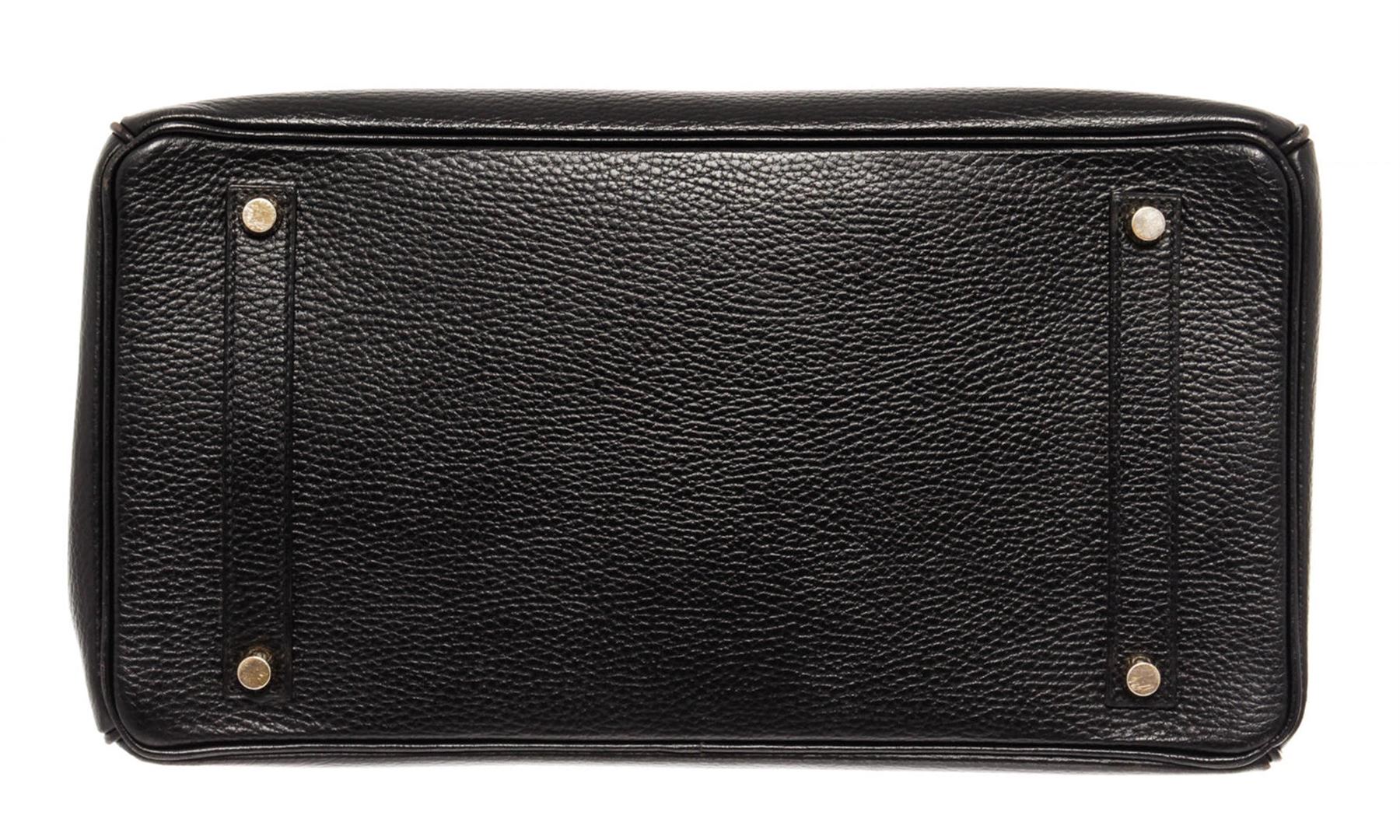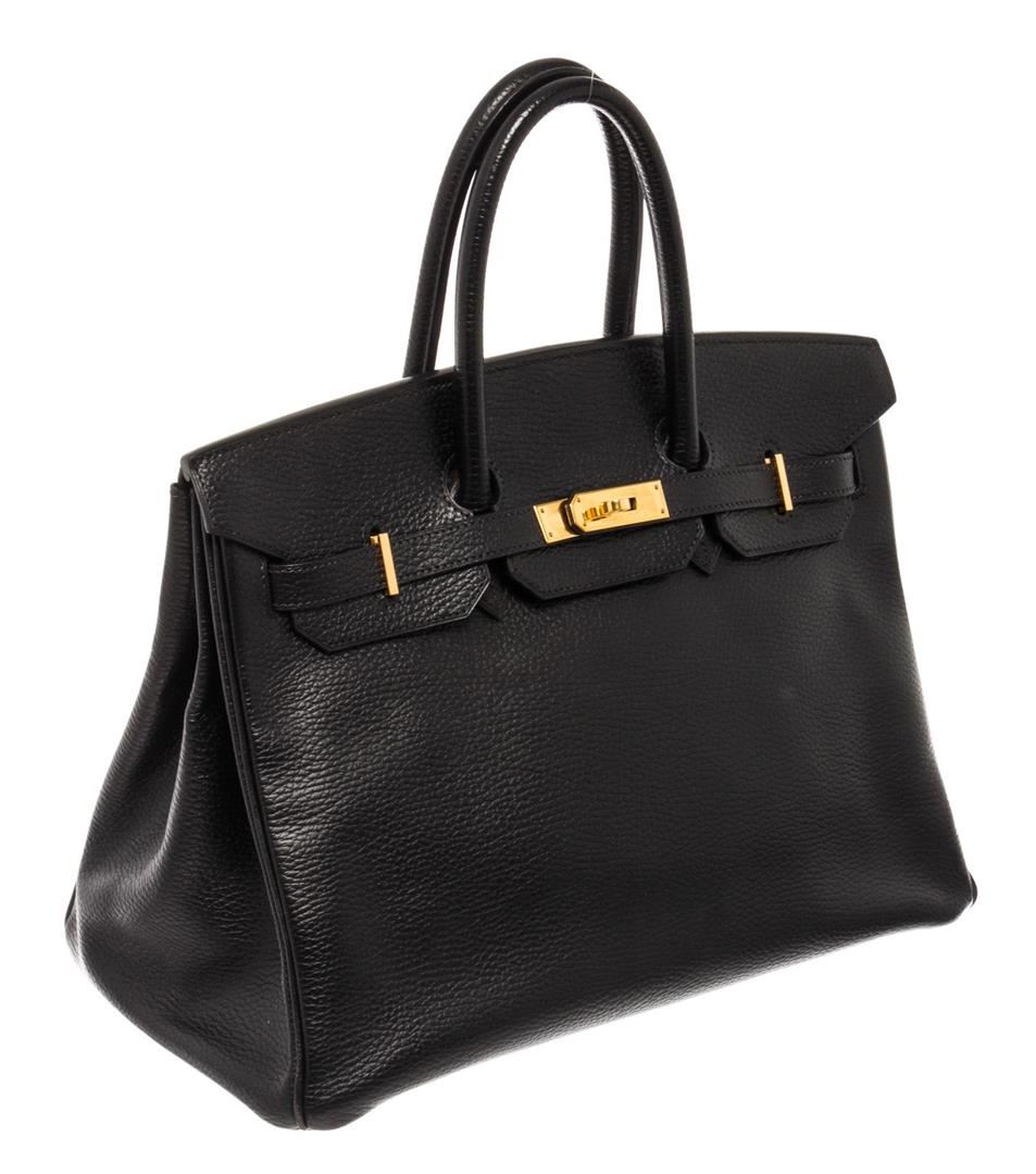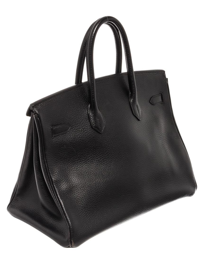 This classic Hermes Birkin 35 cm handbag is done in black Ardennes leather. It features gold-tone hardware, dual rolled top handles and a black Chevre leather-lined interior. The interior has one large compartment, one slide pocket, and one zip pocket. 14" Width x 10" Height x 7" Depth
